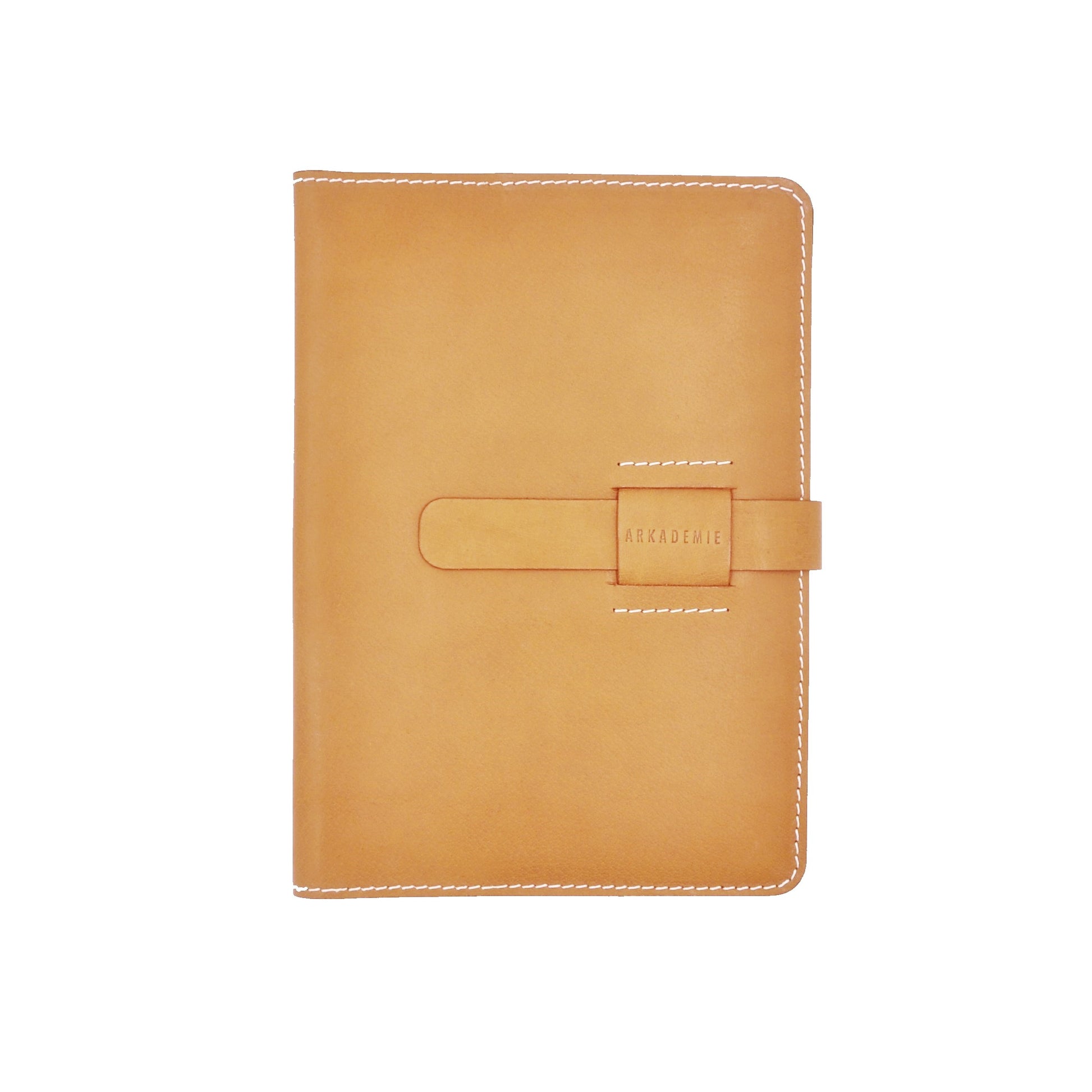 4-oz, natural full-grained European vegetable-tanned, cowhide leather journal and notebook cover in A5 portrait format. The sleeve's leather strap-and-keeper design ensures decades of use without slackening or splitting. The cover is fully and meticulously hand crafted by experienced craftsmen. It comes with a looped pen holder which fits most drawing pens and mechanical pencils.
