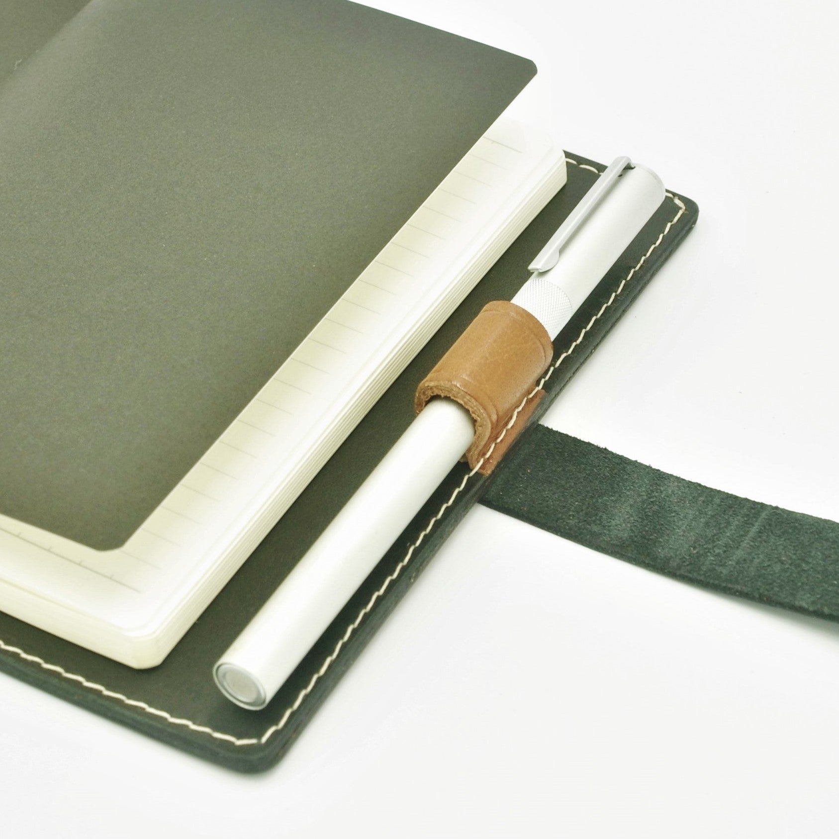 4-oz, natural full-grained European vegetable-tanned, cowhide leather journal and notebook sleeve in A6 portrait format. The sleeve's leather strap-and-keeper design ensures decades of use without slackening or splitting. The sleeve is fully and meticulously handcrafted by experienced craftsmen. It comes with a looped pen holder that fits most drawing pens and mechanical pencils.
