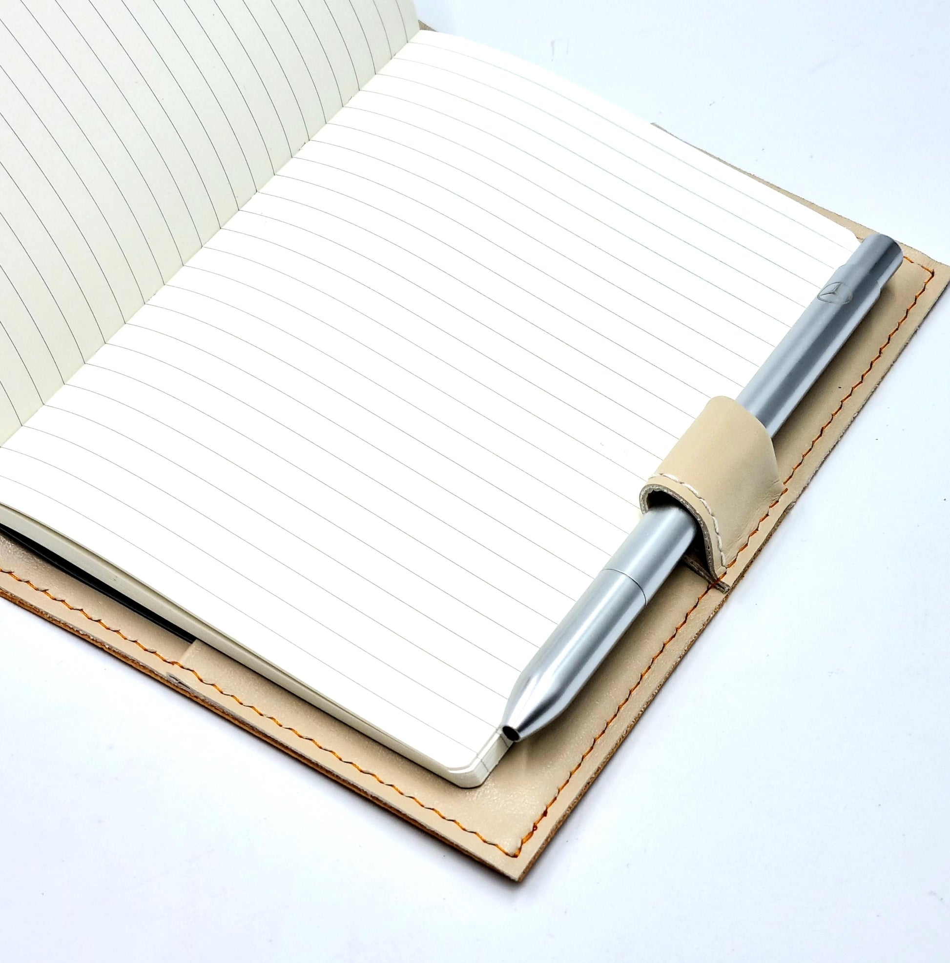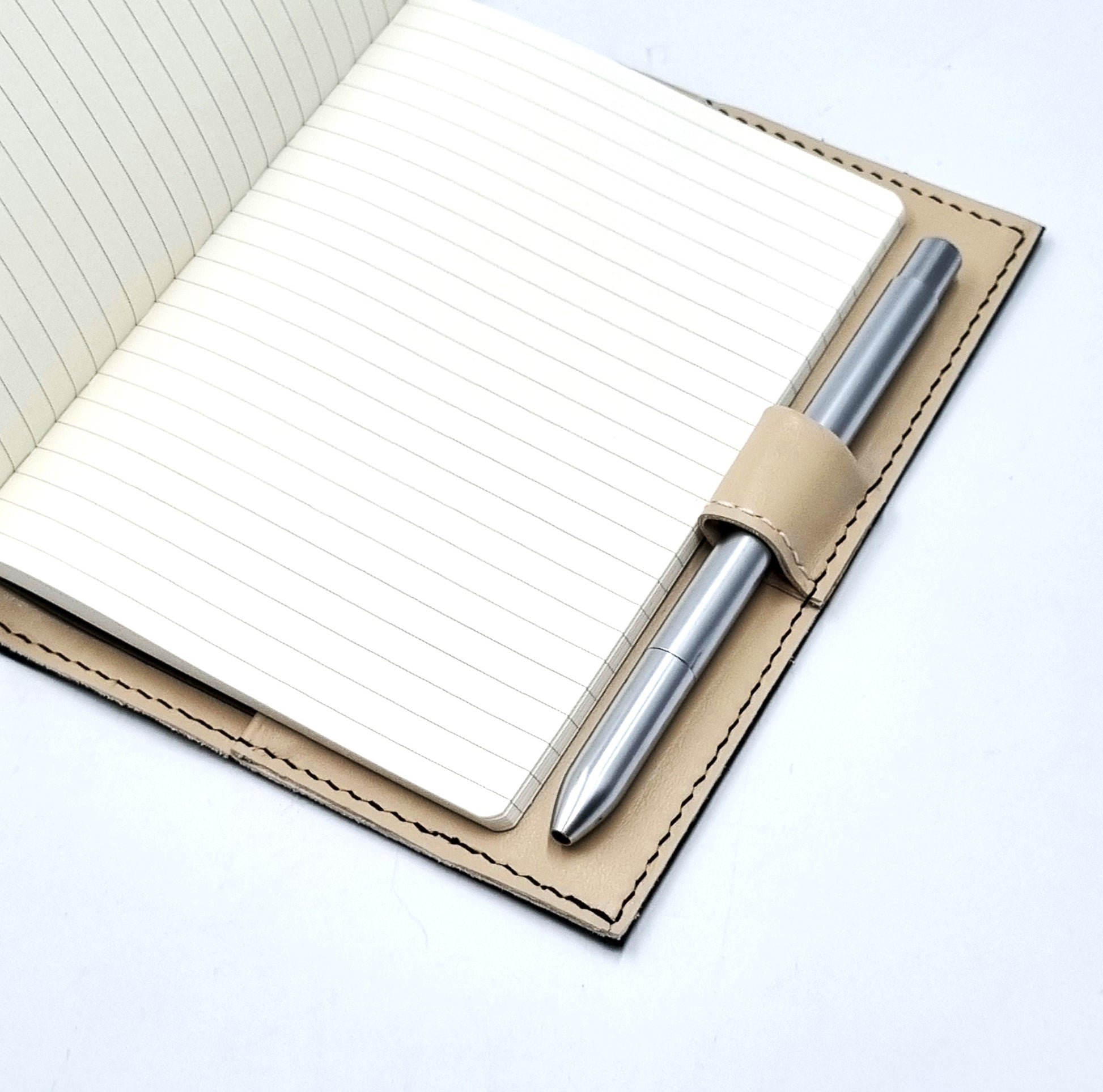 4-oz, natural full-grained vegetable-tanned, European cowhide leather journal and notebook cover in A6 portrait format. Zero-waste design in classic duo-tone colour. The sleeve is fully saddle-stitched by hand - a time-honoured method in leather crafting, which ensure decades of use. It comes with a looped pen holder which fits most drawing pens and mechanical pencils.