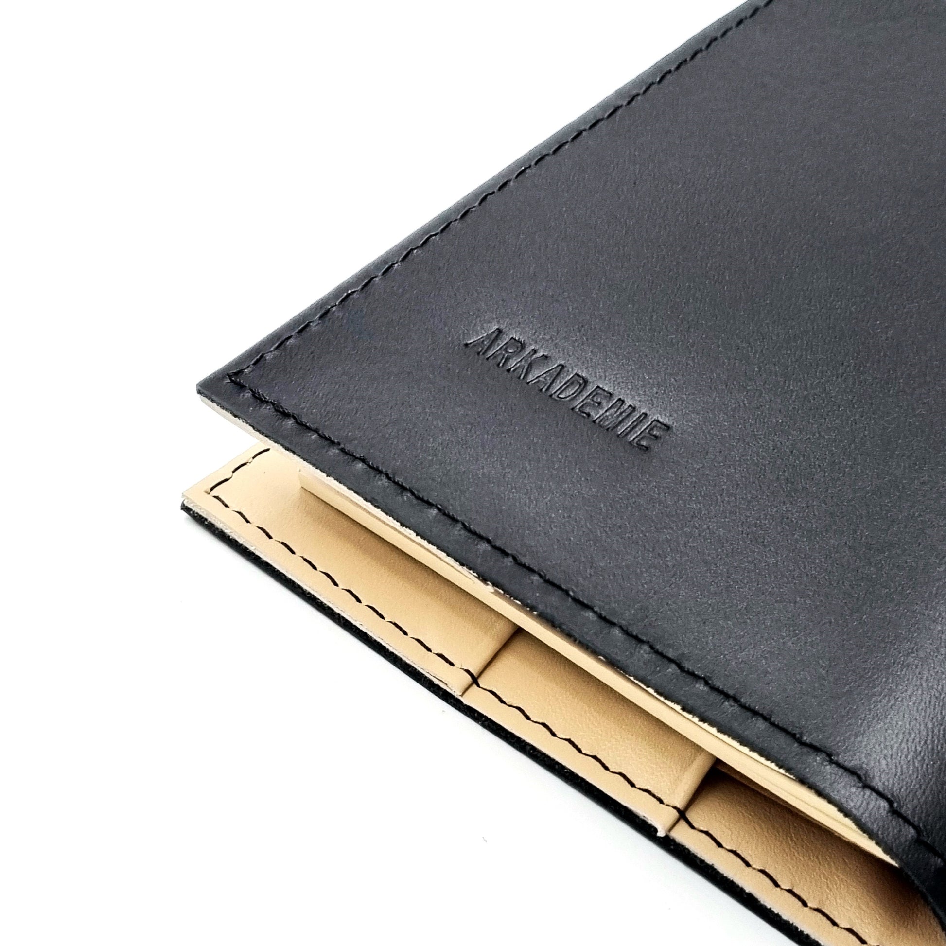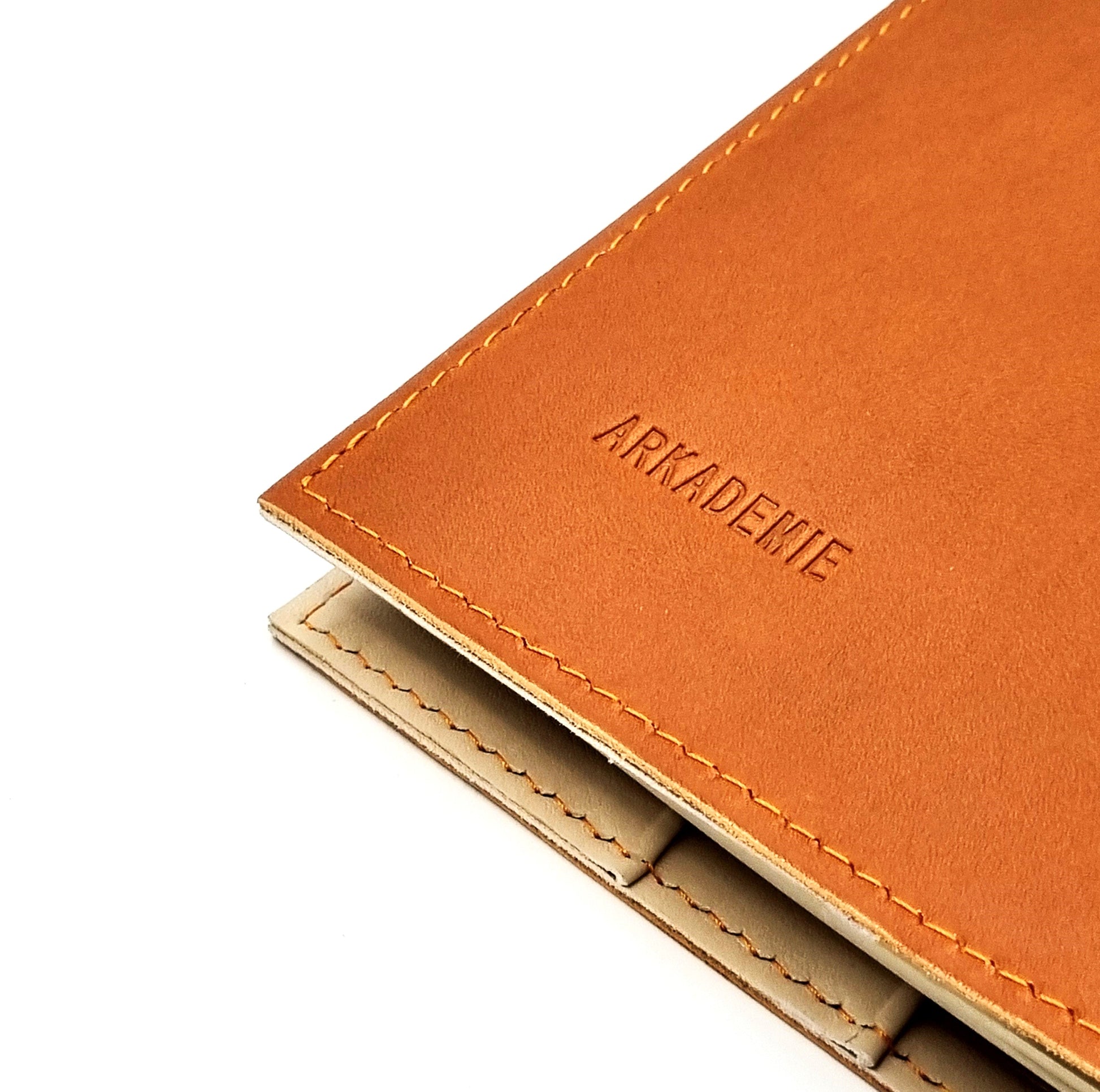Natural leather grain pattern, unique to each hide, can be seen on the cover and will acquire a beautiful natural satin lustre over time.