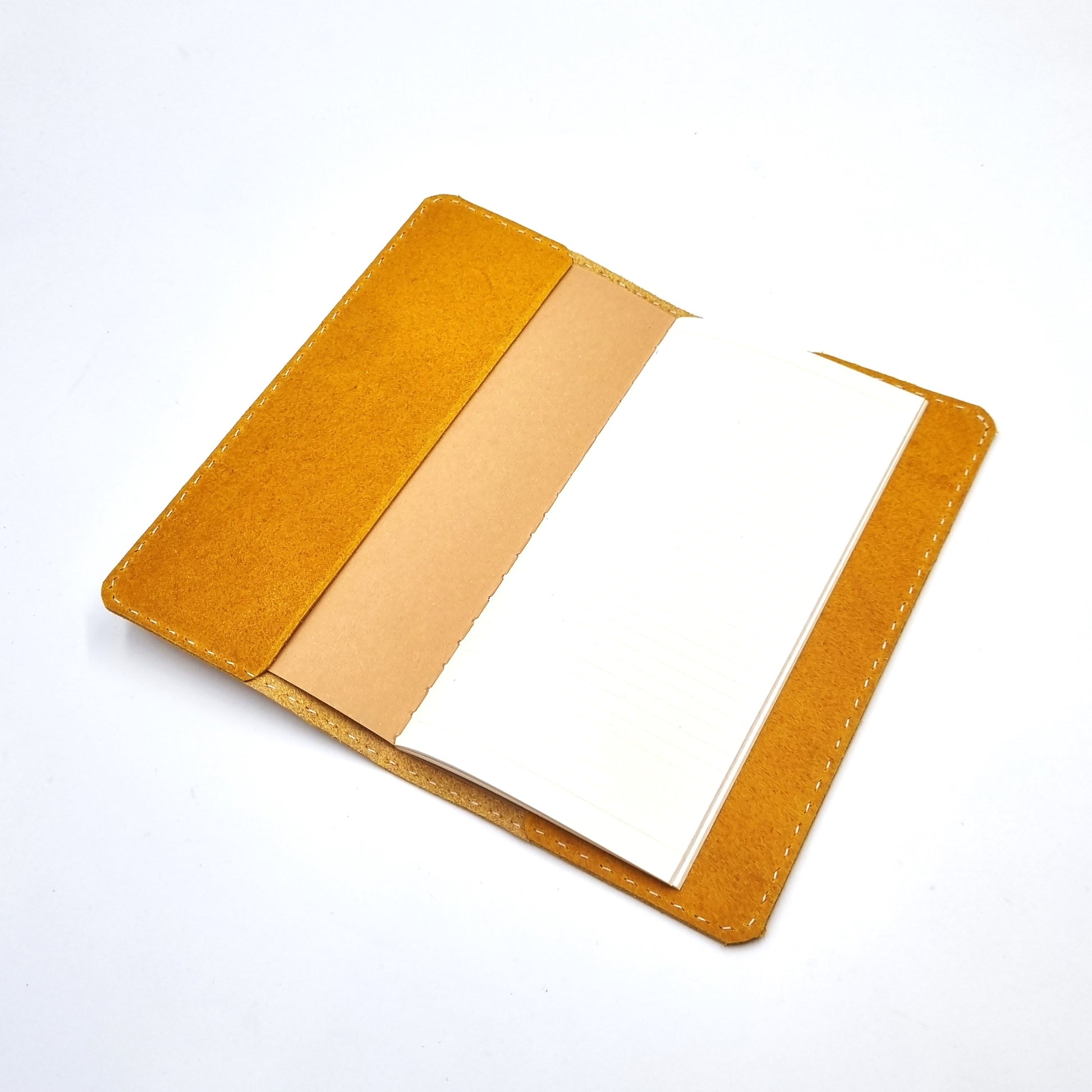 The natural suede textured cover is entirely and meticulously handcrafted by experienced craftsmen. Fits most brands of perfect-bound and saddle-stitched spine DL soft-cover plain journals, notebooks and sketchbooks including Midori, Overjoyed and Traveler's Notebook.