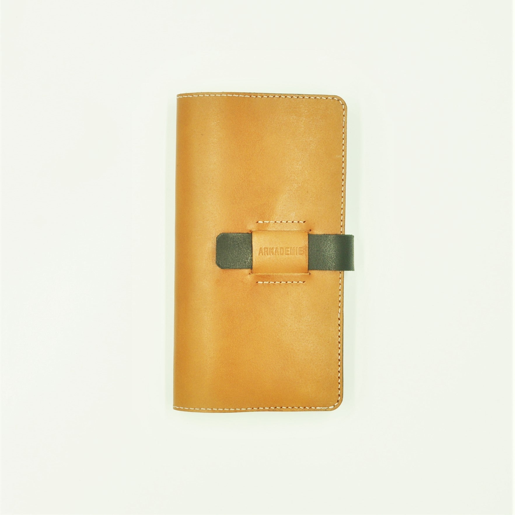 5-oz, natural full-grained vegetable-tanned, buffalo hide leather journal and notebook sleeve in DL portrait format. The sleeve's leather strap-and-keeper design ensures decades of use without slackening or splitting. The sleeve is fully and meticulously handcrafted by experienced craftsmen. Comes with a looped pen holder that fits most drawing pens and mechanical pencils.
