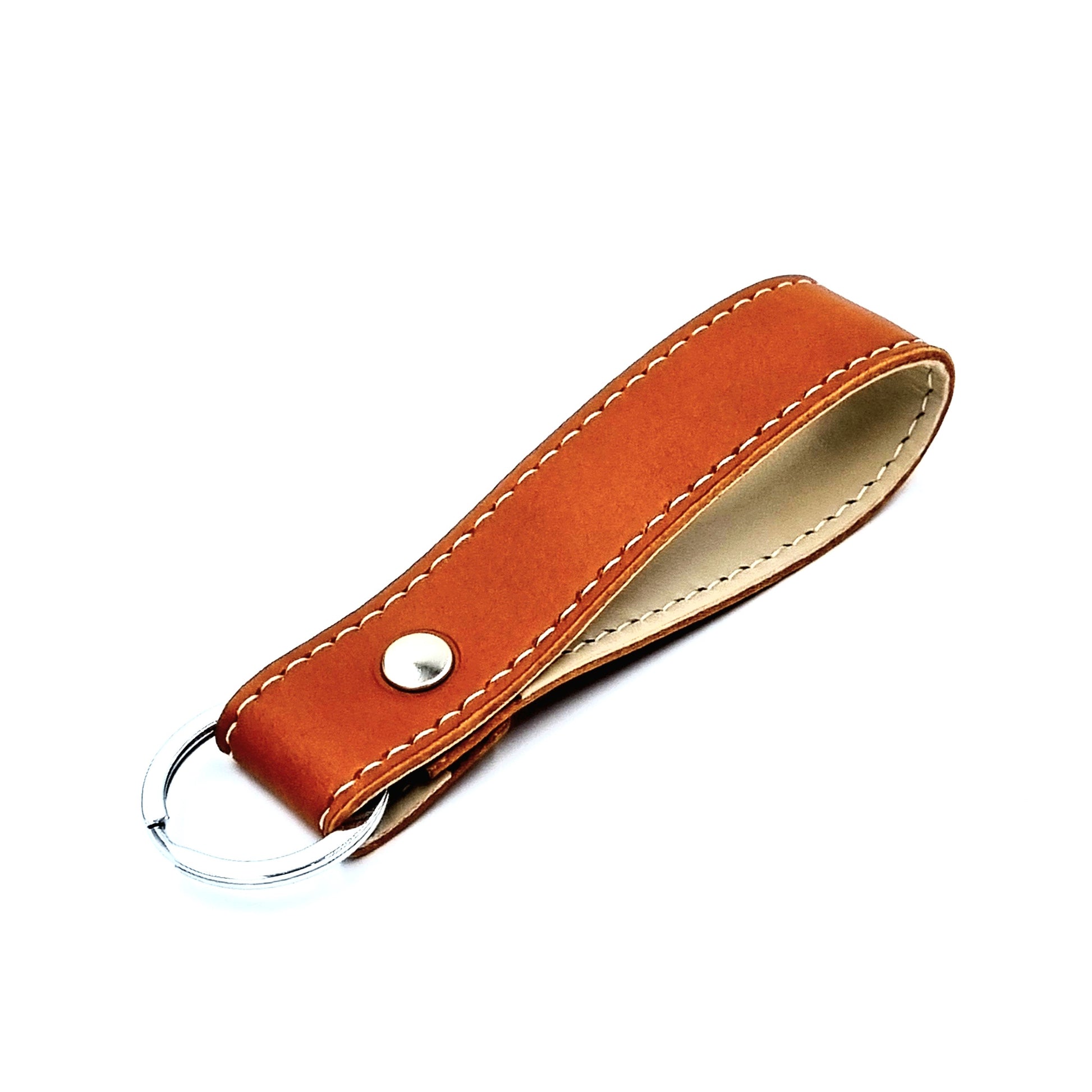 4-oz natural full-grained vegetable-tanned, cowhide leather key fob with stainless steel key ring and matching steel stud.
