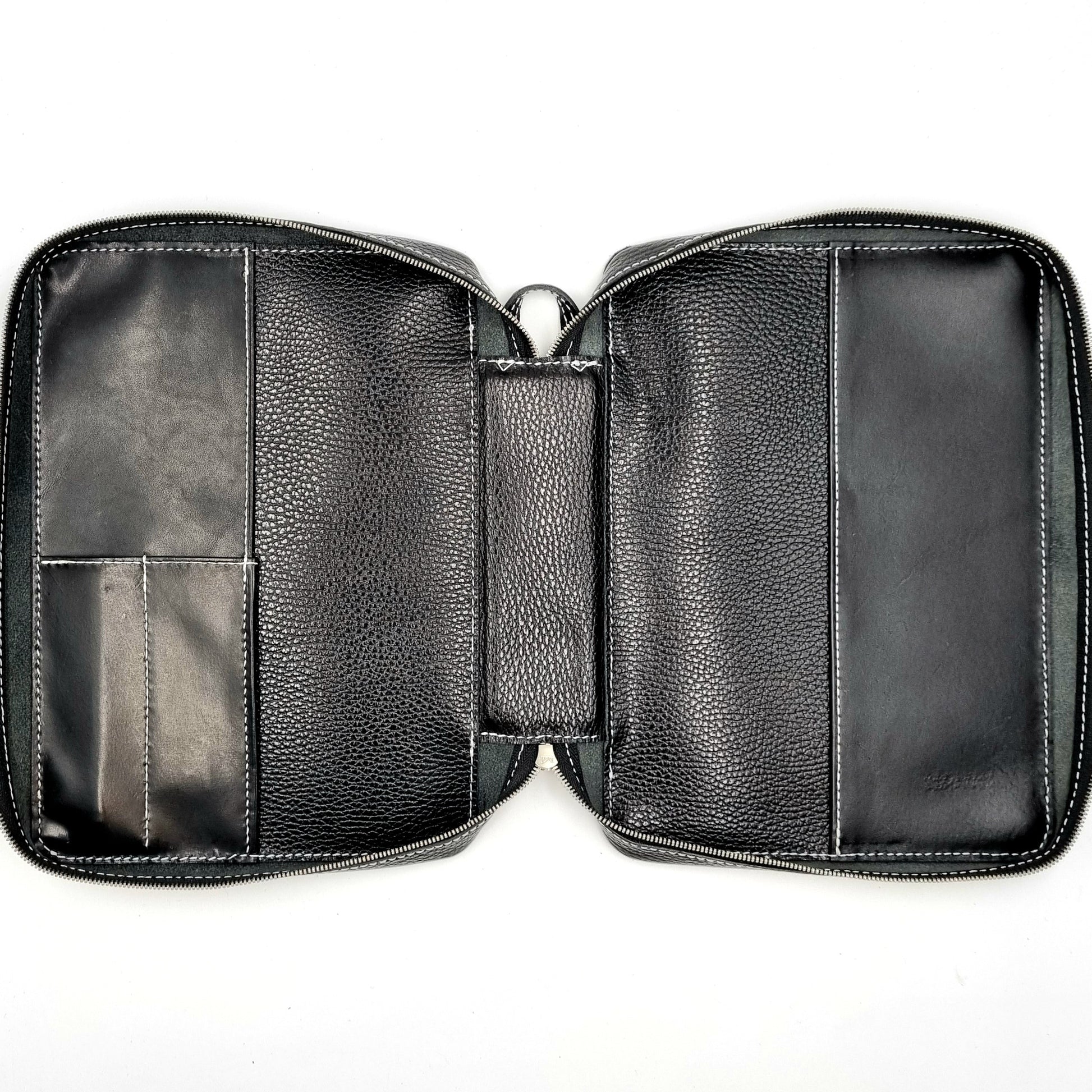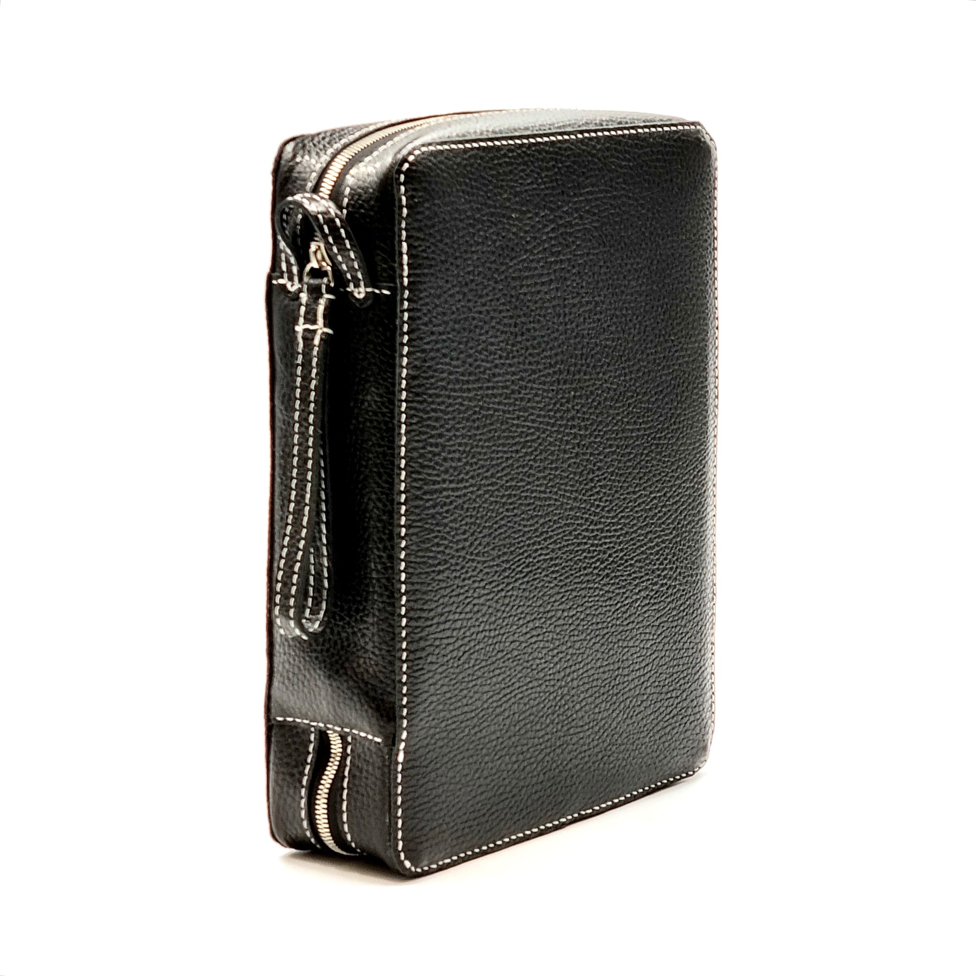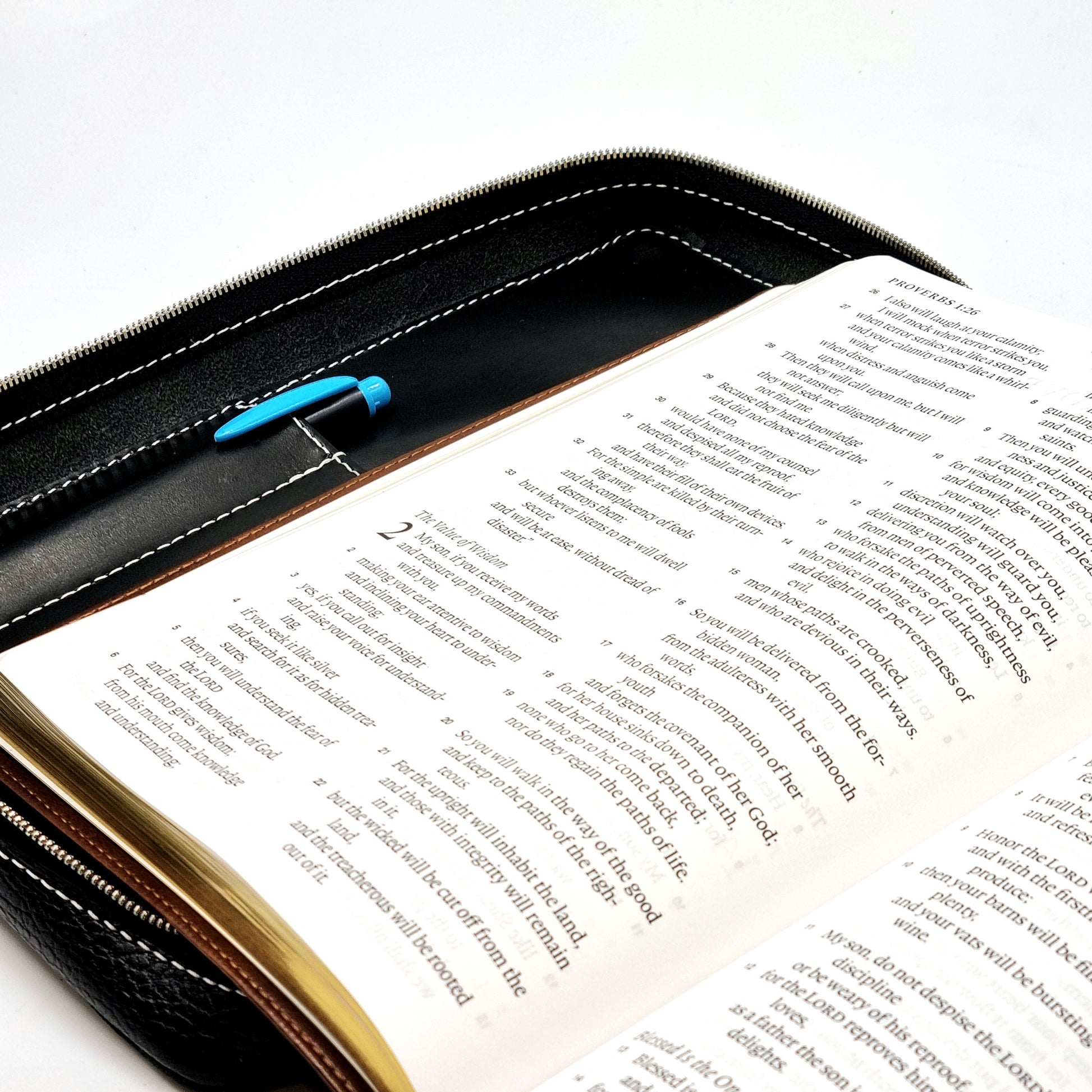 3-oz, natural full-grained Italian DOLLARO vegetable-tanned, pebbled cowhide leather bible folder with built-in pen case in A5 & B5 portrait formats. The lining is of genuine Italian cowhide leather, providing additional protection and cushioning for the bible.  Zipper with long handle for easy carriage.  The cover full leather design ensures decades of use without slackening or splitting.  Fully and meticulously hand crafted by experienced craftsmen.
