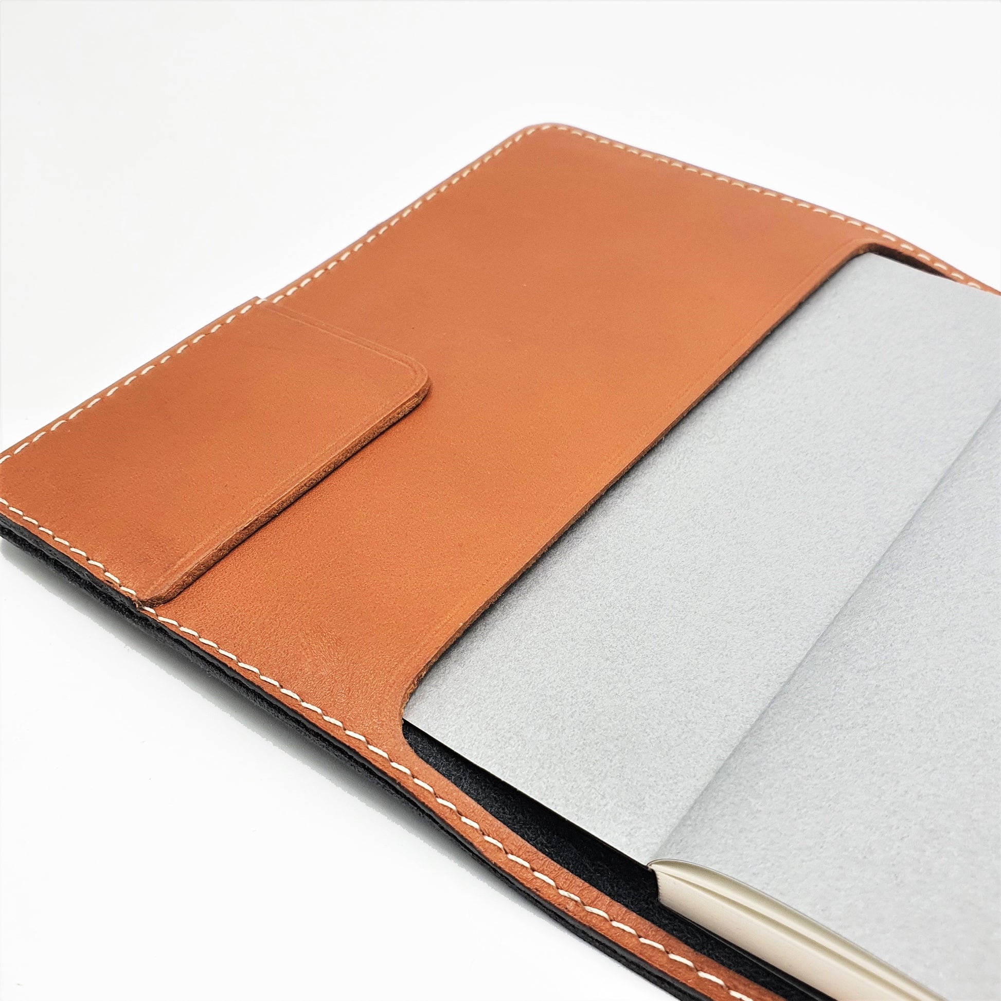 4-oz, natural full-grained vegetable-tanned, European cowhide leather journal and notebook sleeve in A6 portrait format. Zero-waste design in classic duo-tone colour. The sleeve is fully saddle-stitched by hand - a time-honoured method in leather crafting, which ensure decades of use. It comes with double looped pen holders which fits most drawing pens and mechanical pencils.