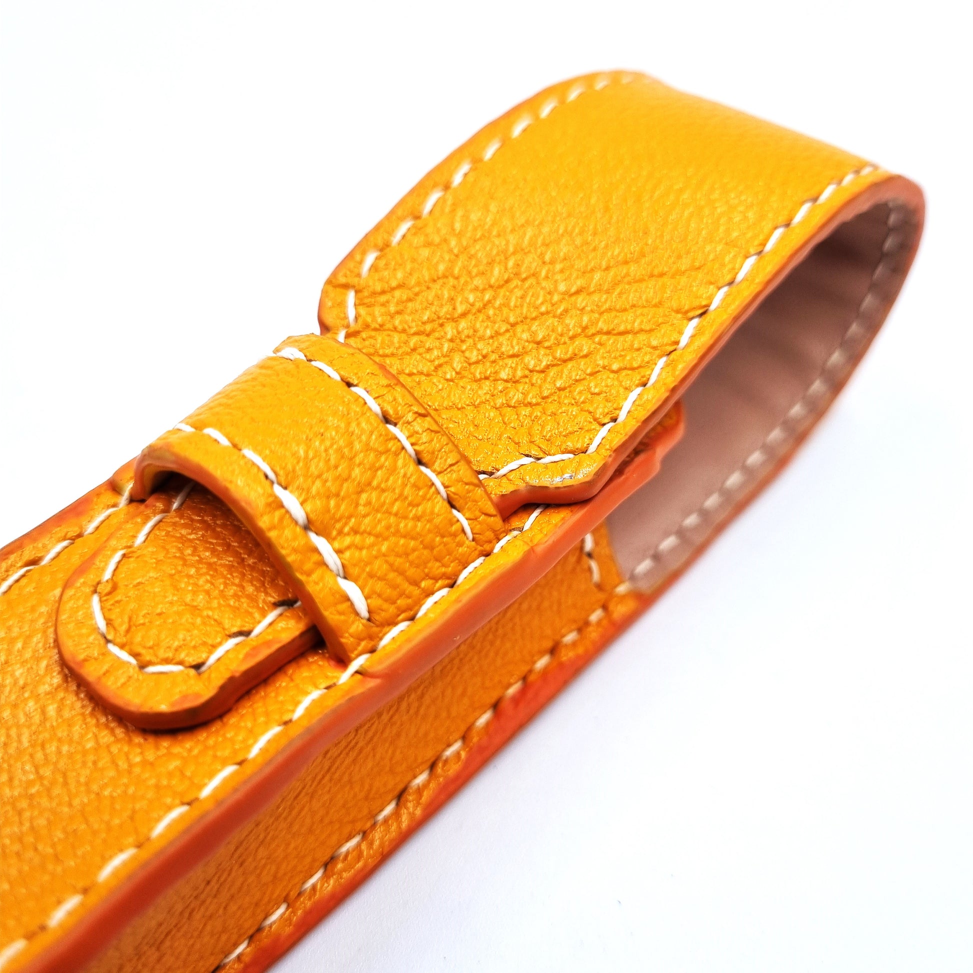 Cover and keeper are made with 3-oz vegetable-tanned French ALRAN SULLY goatskin leather. Entirely hand-stitched, hand-painted and waxed.