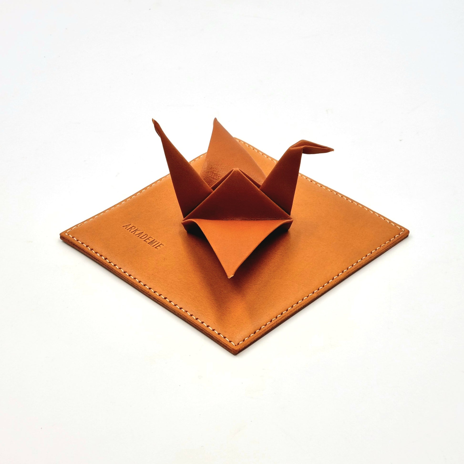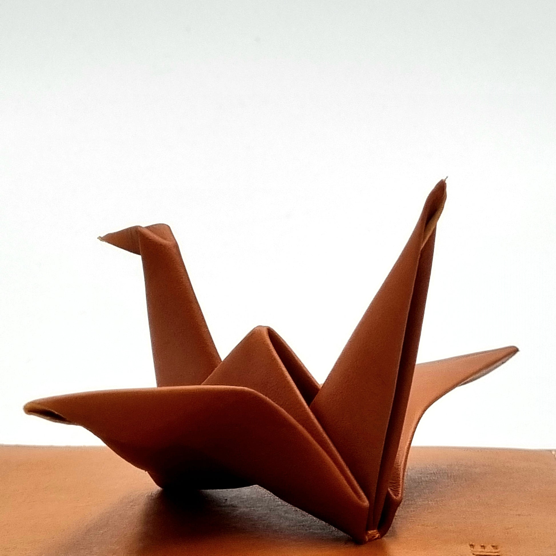 Full-grained, Italian vegetable tanned leather is used for the construction of the crane article and base, ensuring sufficient stiffness and foldability. Every set of orizuru and base is hand-cut, scored, meticulously folded and hand-stitched. Waxed threads are used to strengthen the seams and bind the leather components, and the entire piece is saddle-stitched for extended durability - a traditional and time-honoured method in fine leathercrafting.