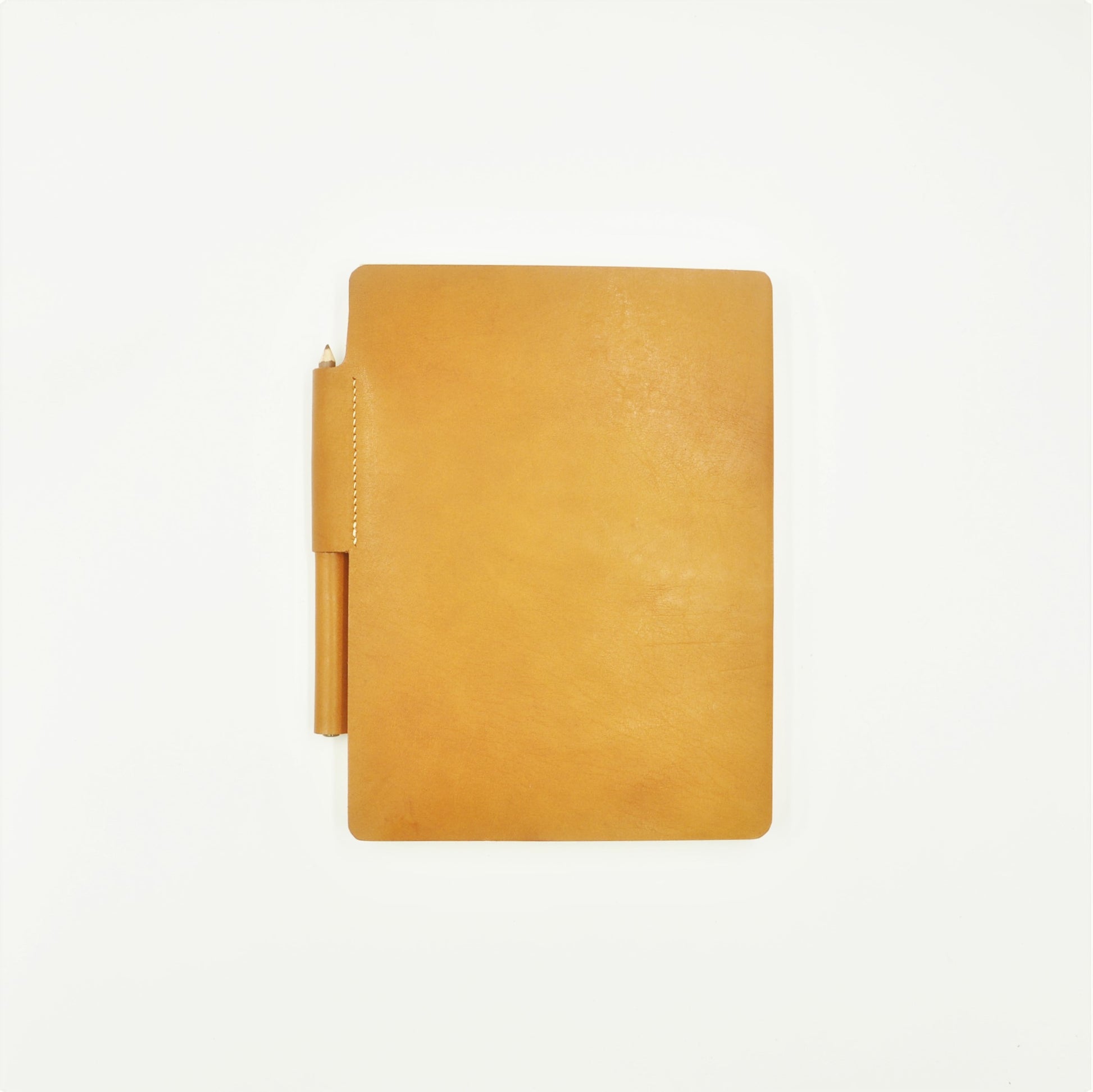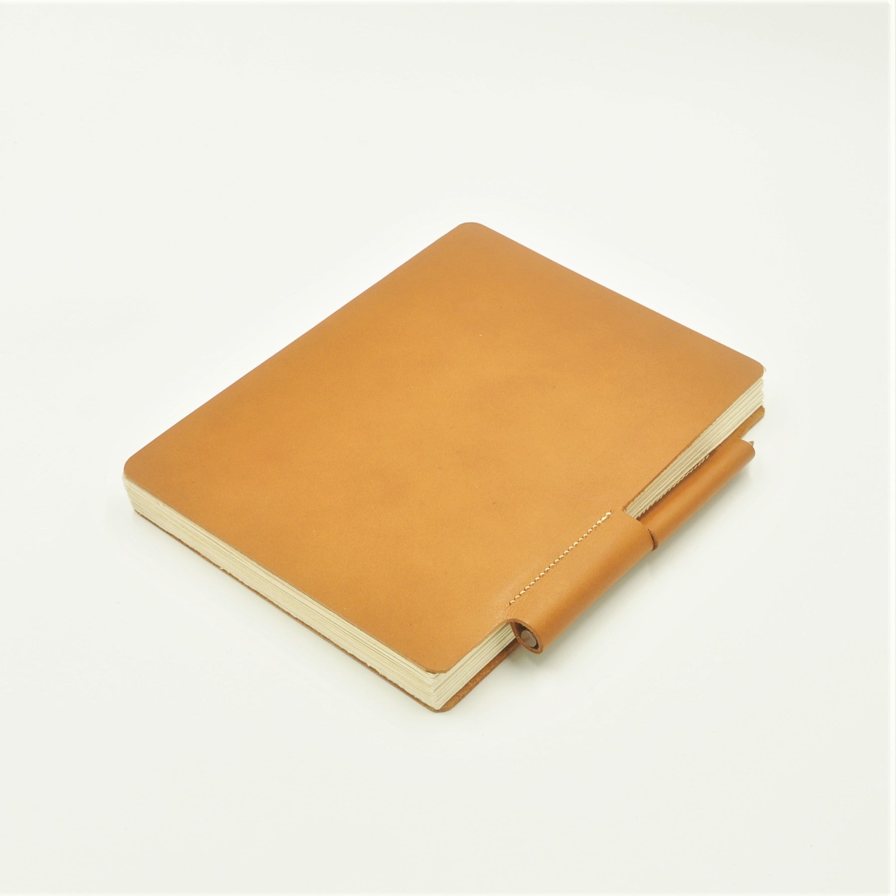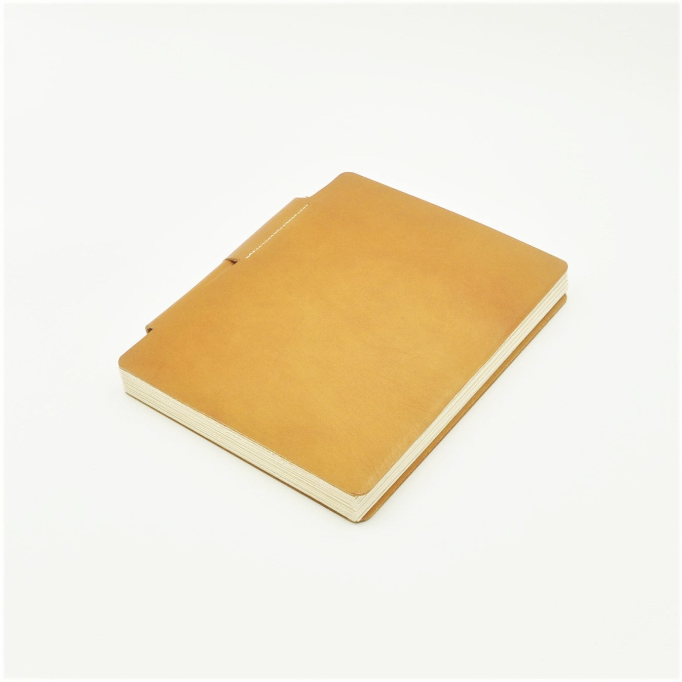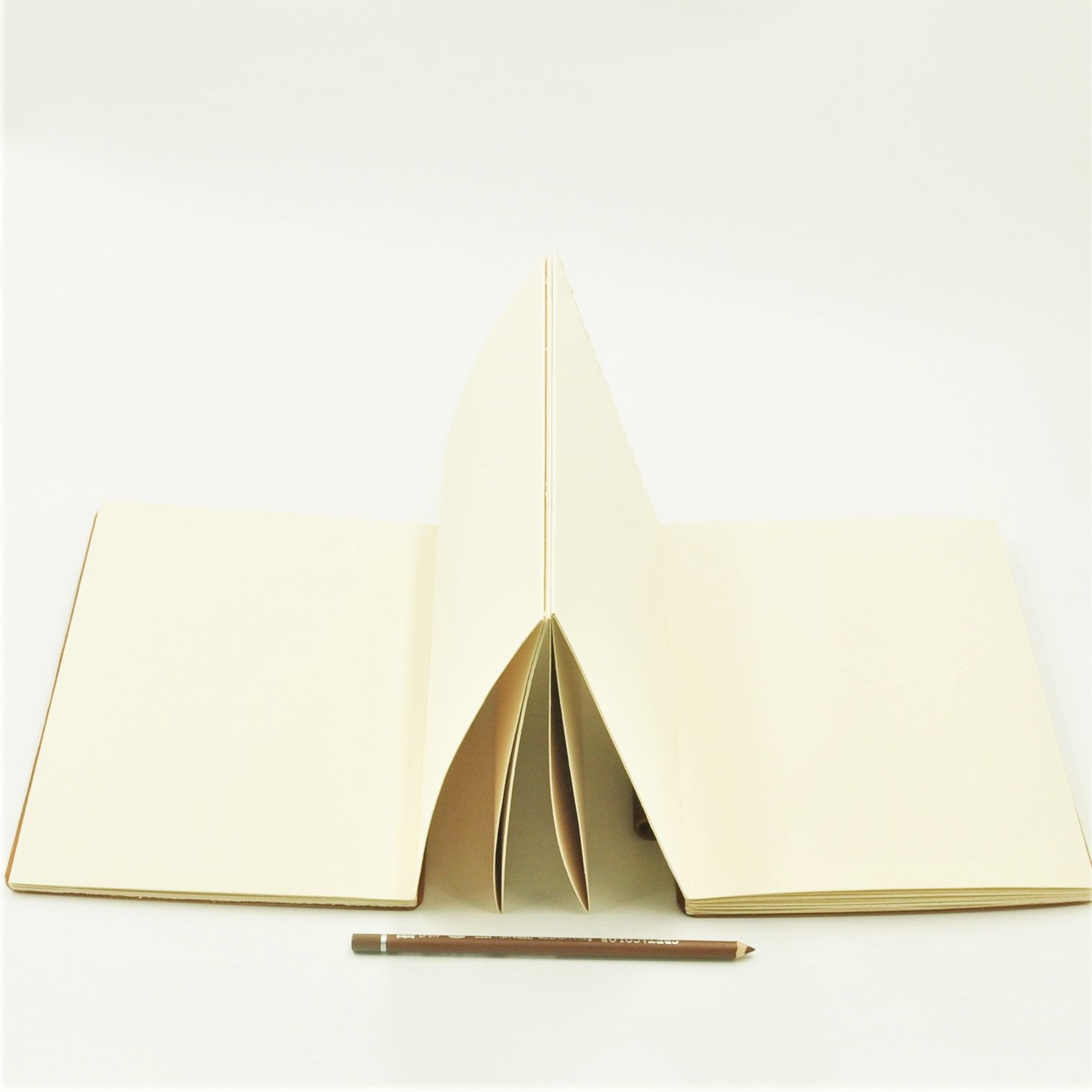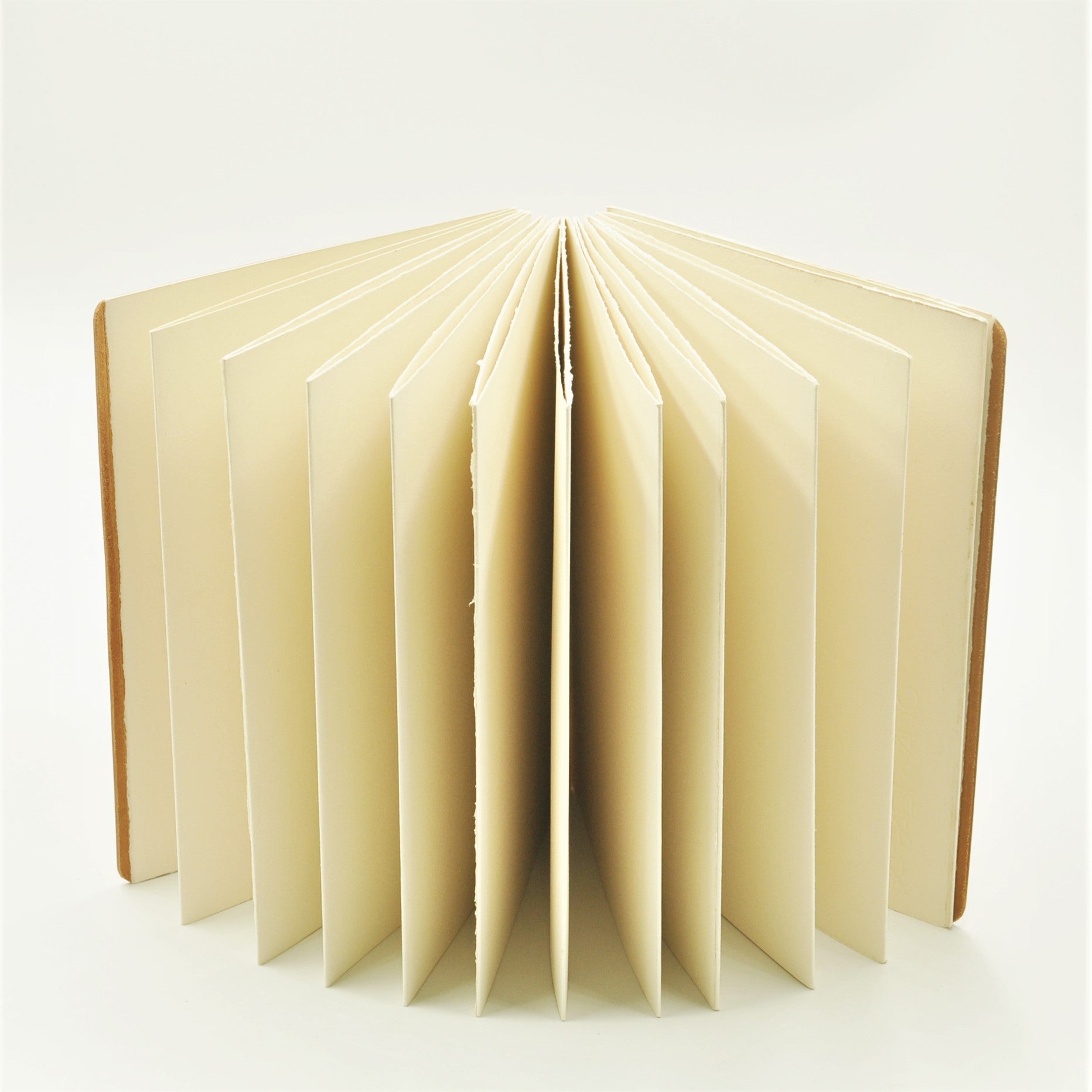 Genuine 4-oz natural full-grained vegetable-tanned European cowhide leather cover accordion sketch album, with 48 pages, continuous archival paper album strip using Italian FABRIANO Rosapina Ivory 220 gsm paper. The paper stock is fully hand-deckled to retain the authentic aesthetics of the artist's paper, and is attached to the leather covers designed with a looped-hinge which is locked with a wooden pencil. The album can be expanded and retracted with the removal and insertion of the pencil. Paper album opens to a full length of 2.88 meters.