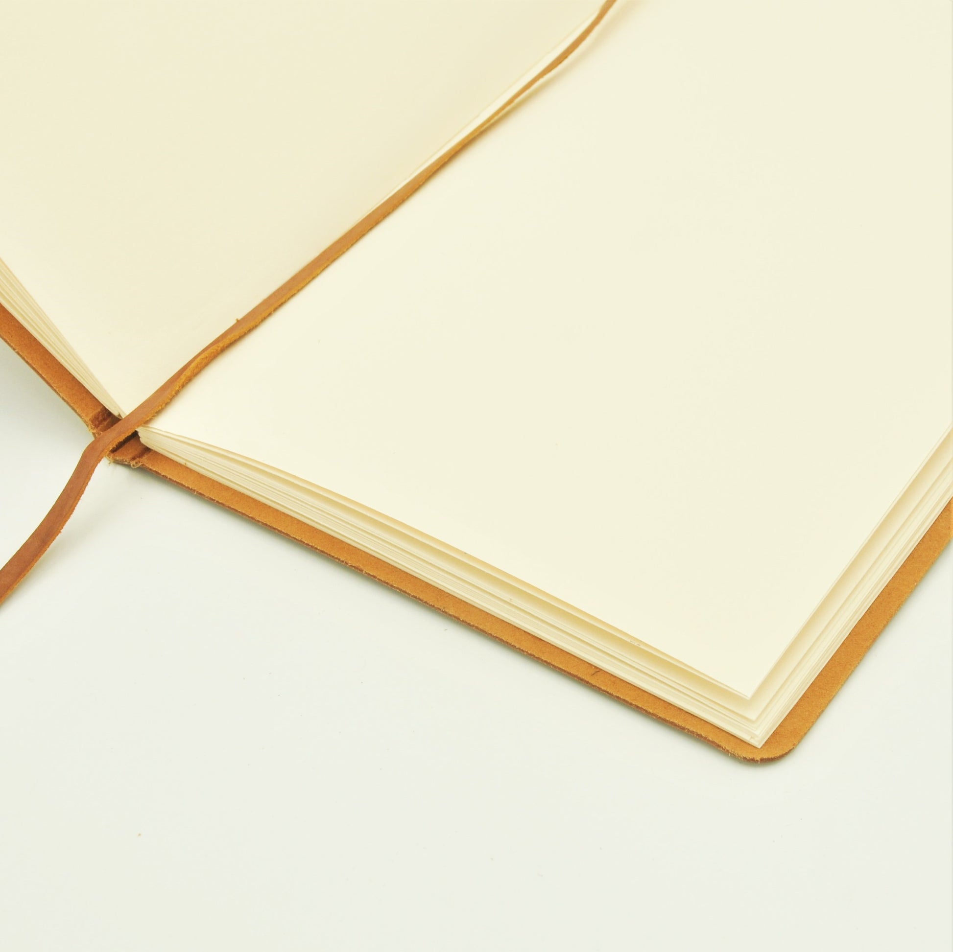 The cover is made with 5-oz natural, full-grain vegetable-tanned buffalo leather, prized for its bold and unique character and grain pattern, and will acquire a beautiful natural satin lustre over time. Leather protects the paper stock for decades while the value of the journal increases when design and artistic contents are included.
