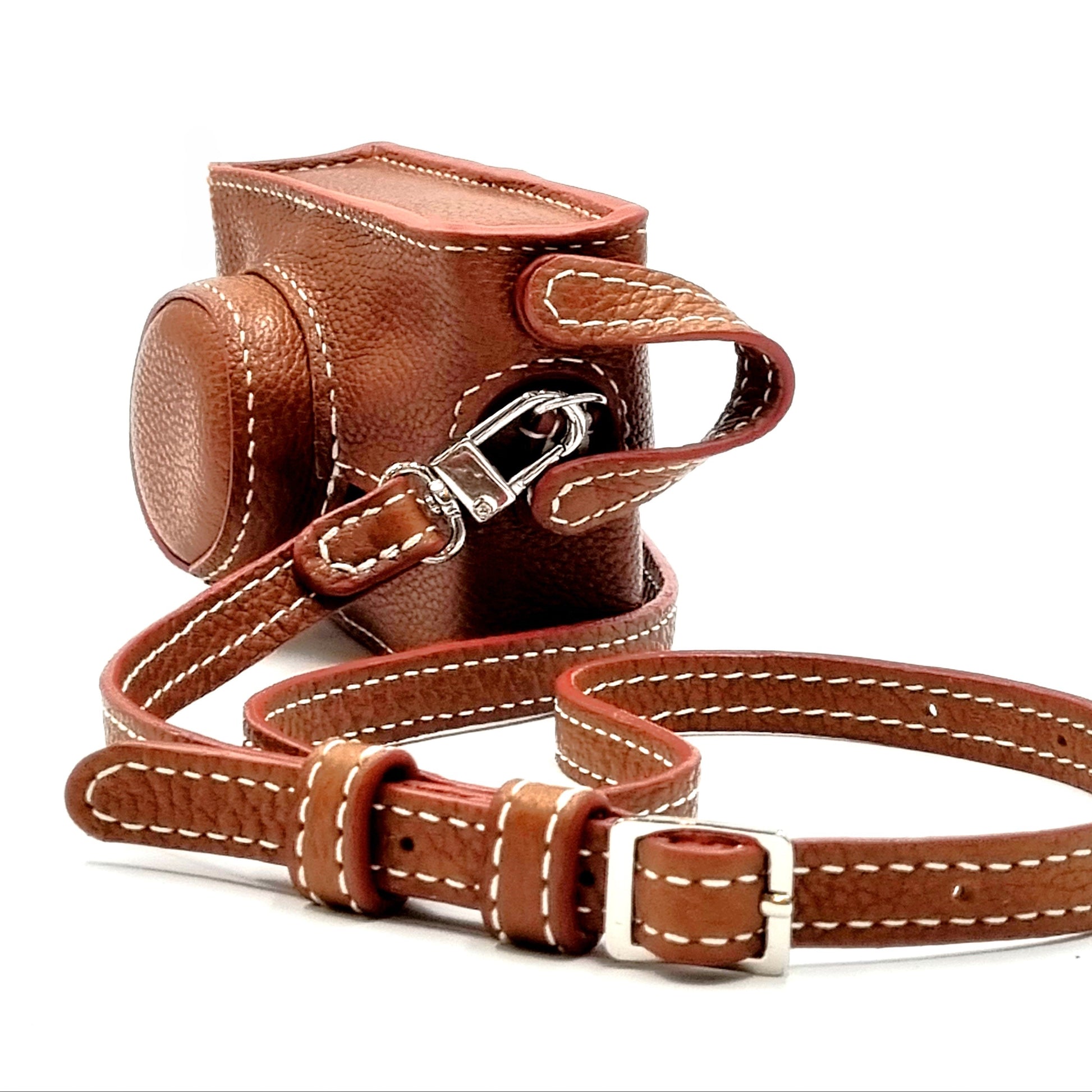 Custom-designed leather full and half case with strap for compact, SLR, DSLR and TLR cameras. Crafted using premium double-tanned calfskin leather - Barenia Faubourg - from the French Tanneries Haas that has been manufacturing premium leathers for nearly 200 years.