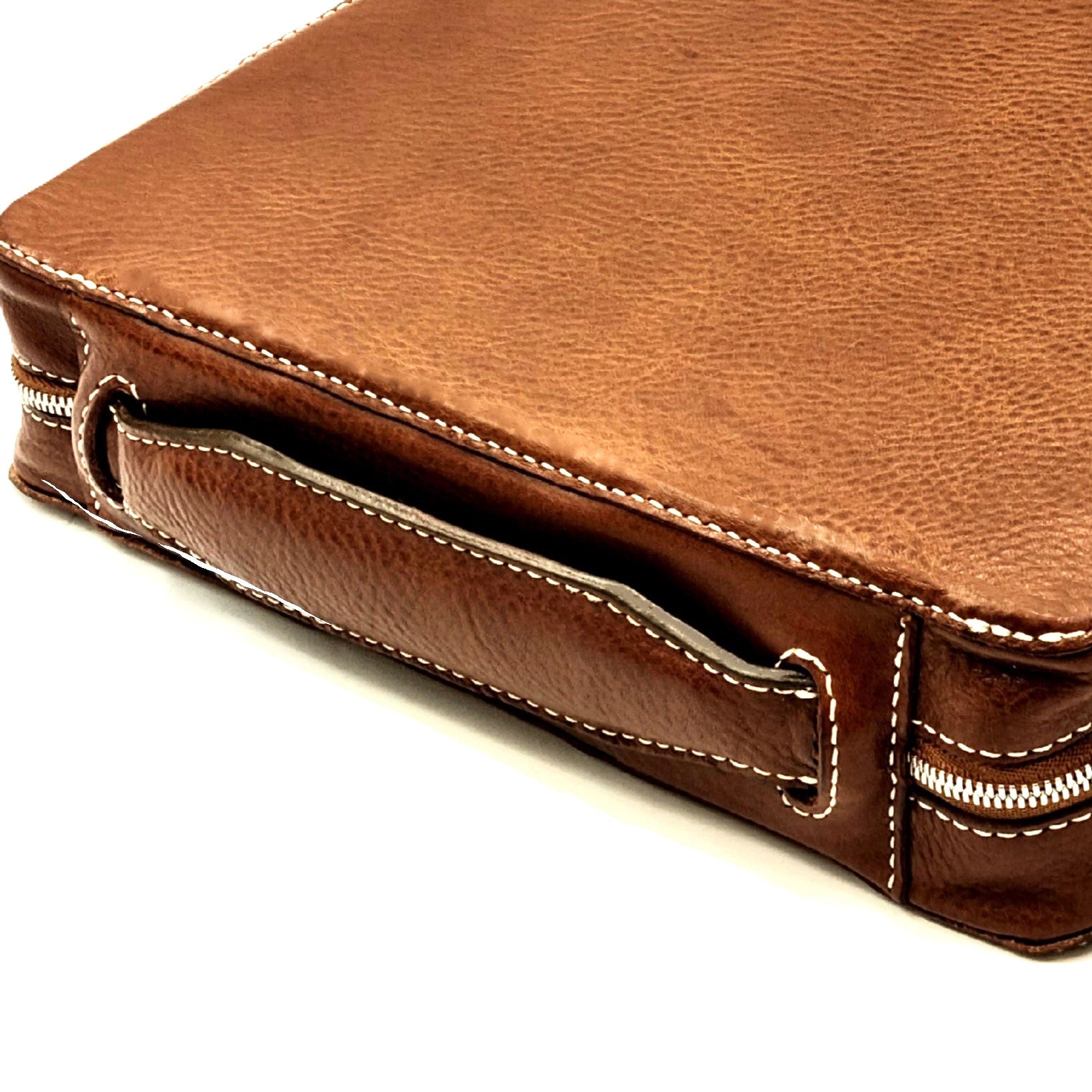 3-oz, natural full-grained Italian VOLANATO vegetable-tanned, cowhide leather bible holder with built-in pen case in A5 & B5 portrait formats. The lining is of genuine Italian cowhide leather, providing additional protection and cushioning for the bible. Holder handle at the spine for easy carriage. The cover full leather design ensures decades of use without slackening or splitting. Fully and meticulously hand crafted by experienced craftsmen.