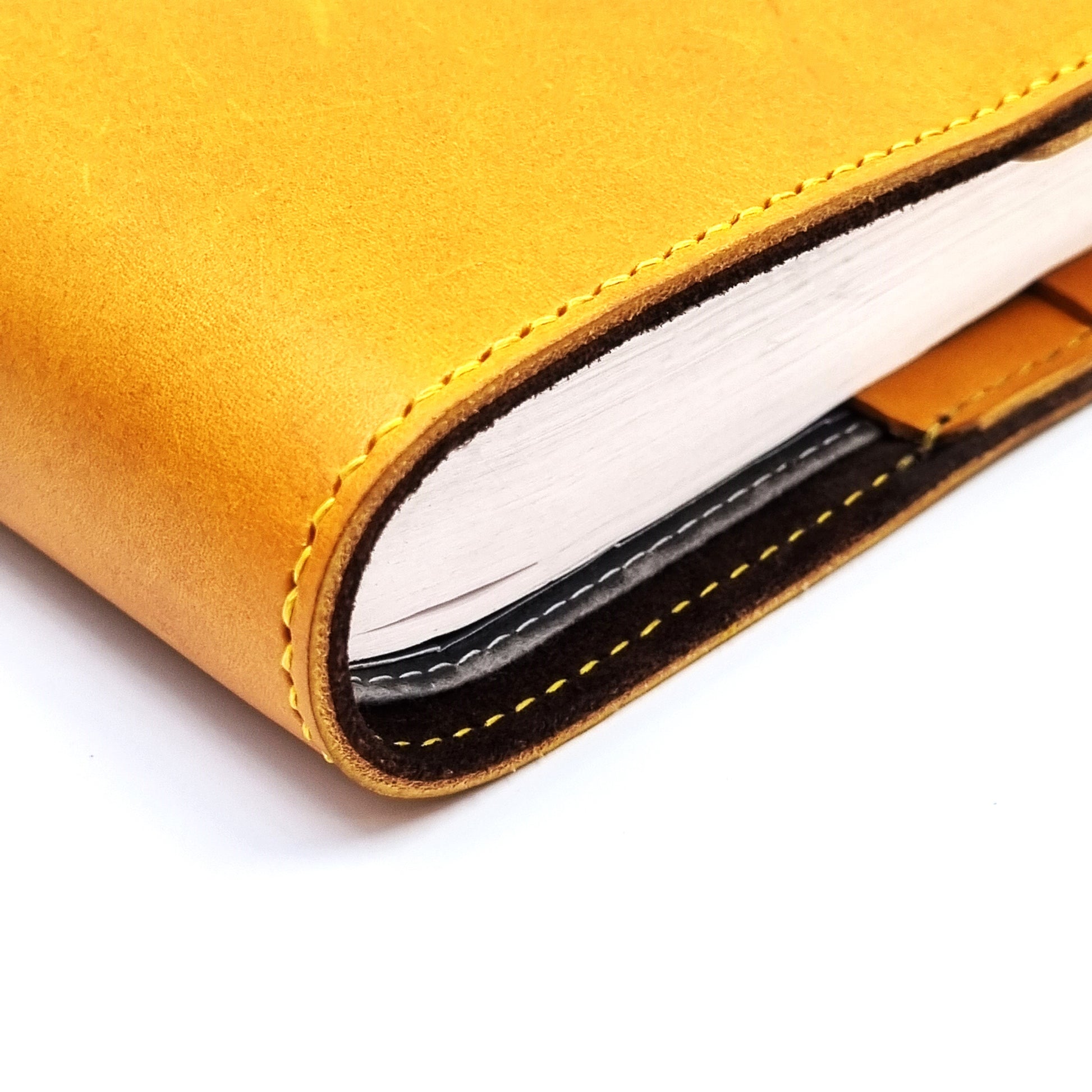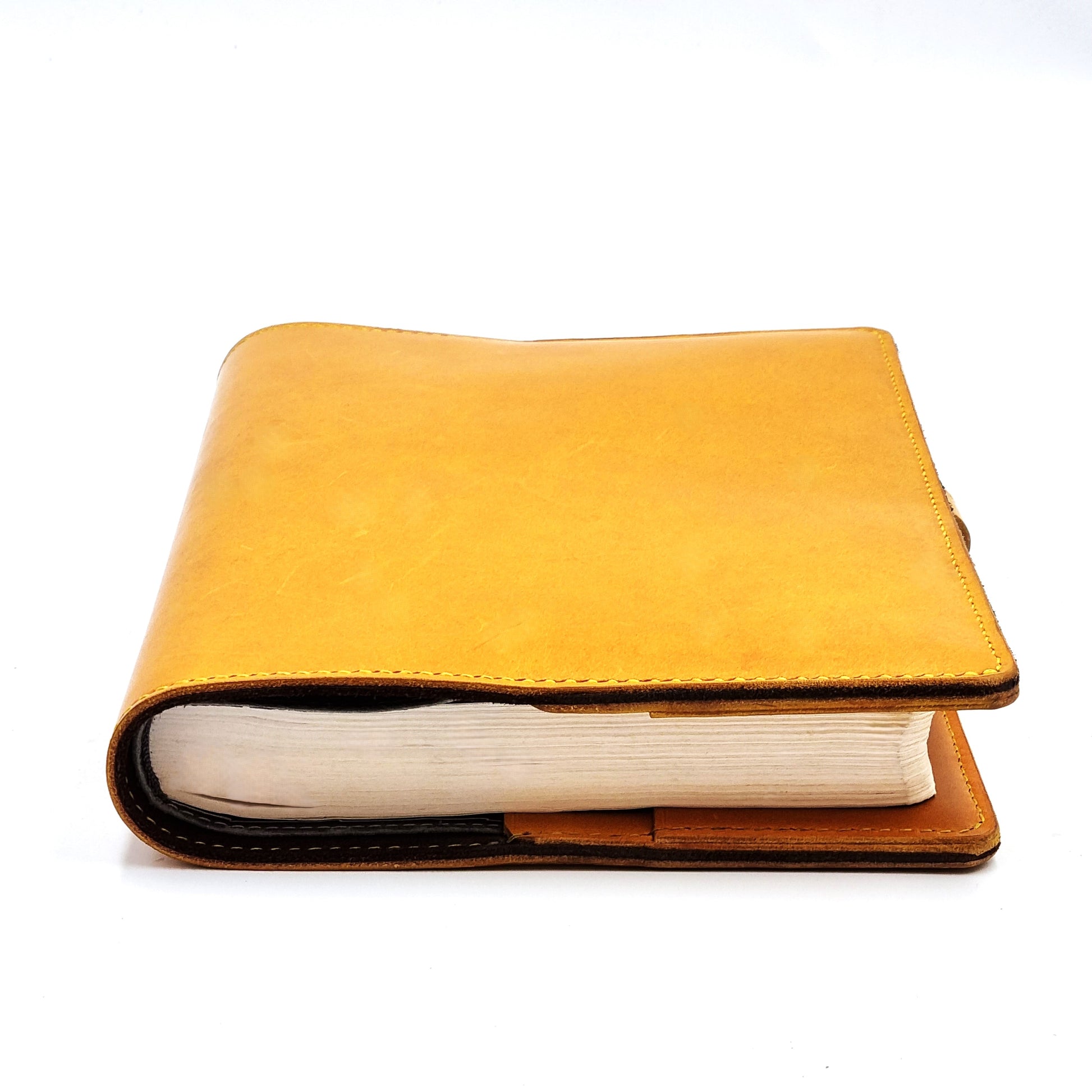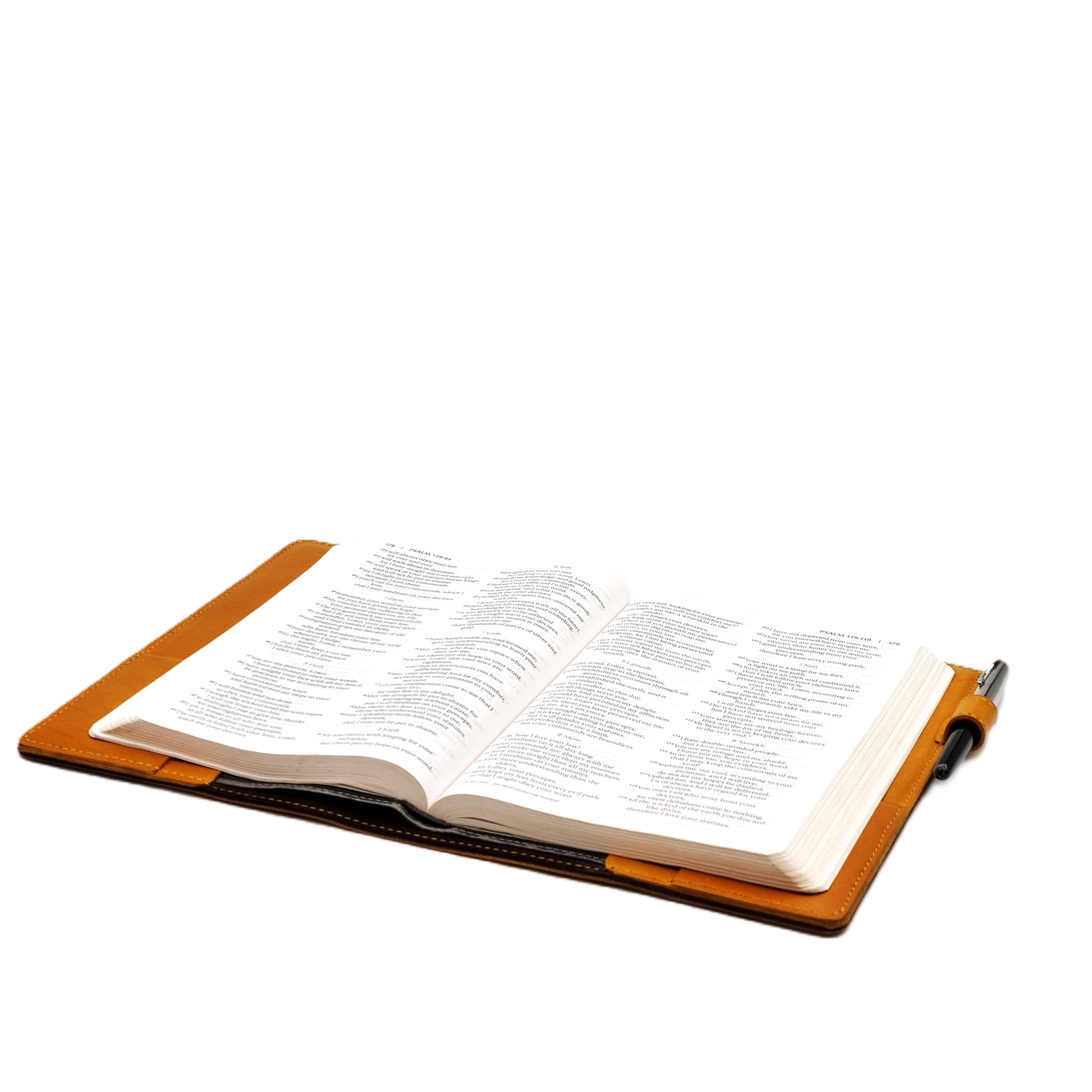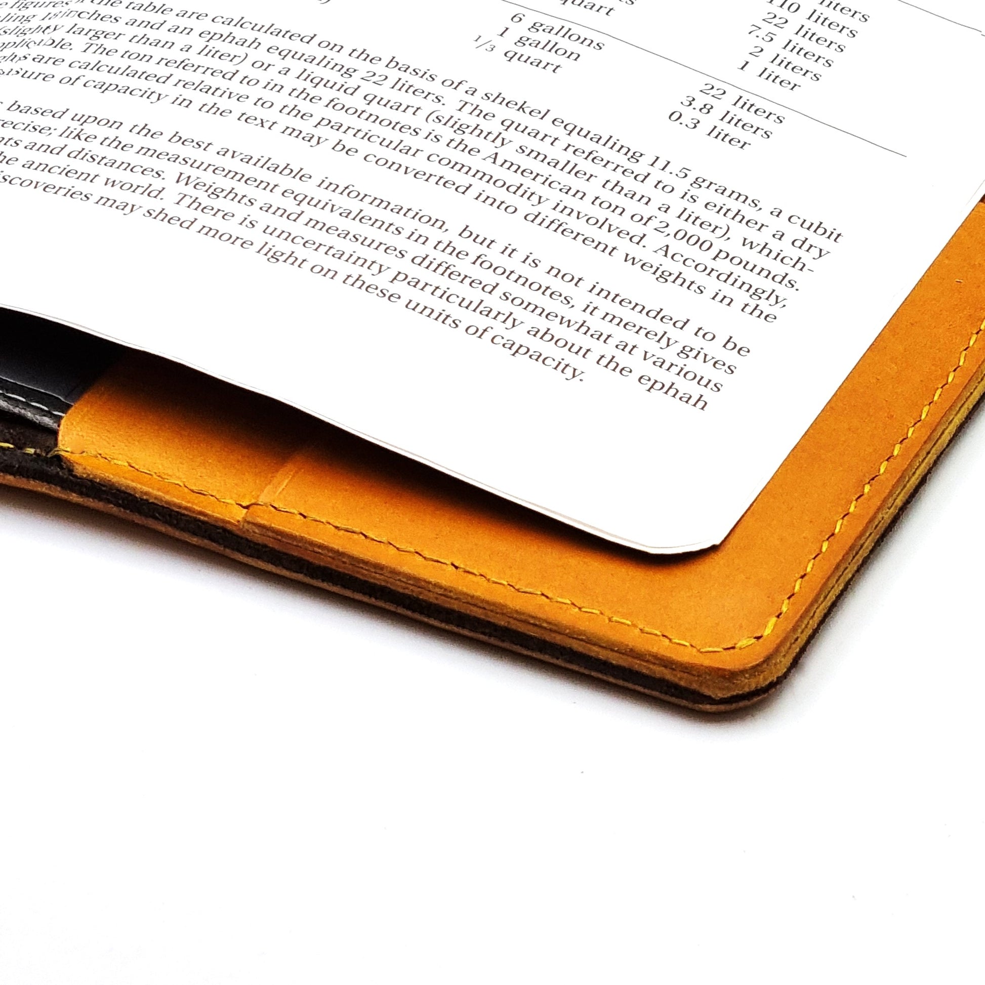 3-oz, natural full-grained Italian BUTTERO vegetable-tanned, cowhide leather bible cover in A5 portrait format. The lining is of genuine Italian suede leather, providing additional protection and cushioning for the bible.  The cover full leather design ensures decades of use without slackening or splitting.  The cover is fully and meticulously hand crafted by experienced craftsmen.