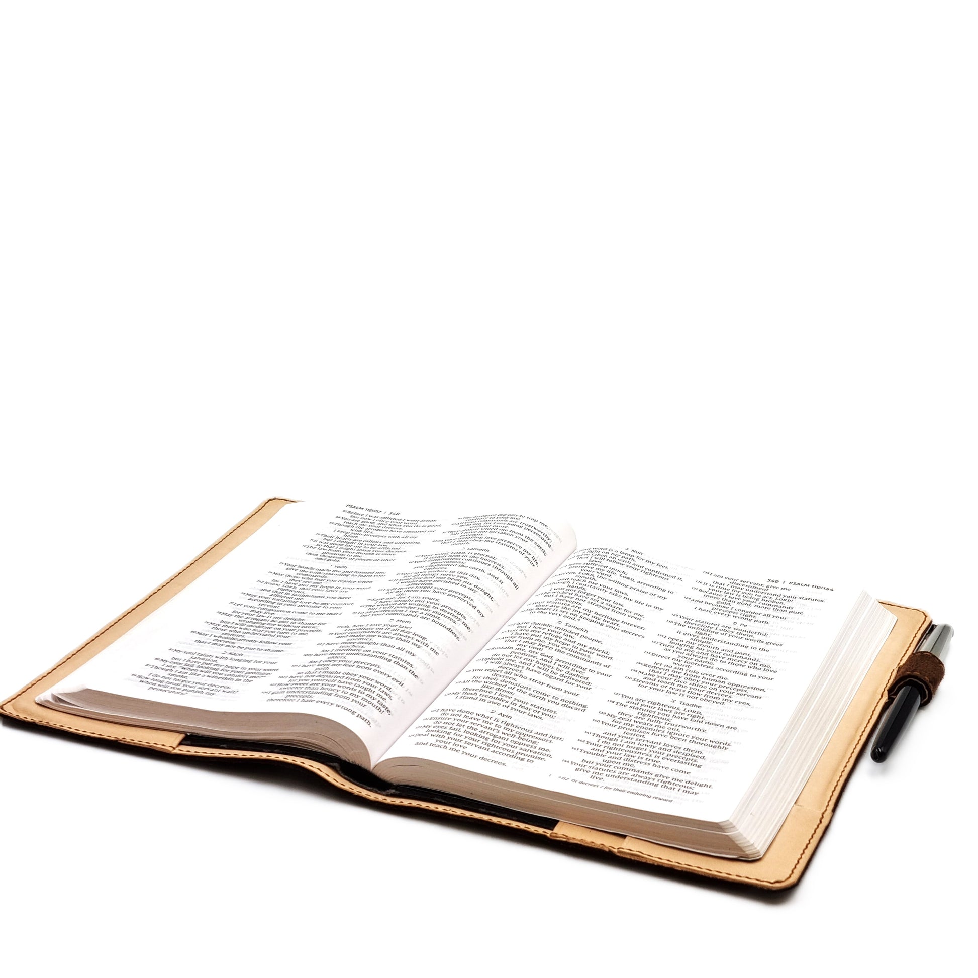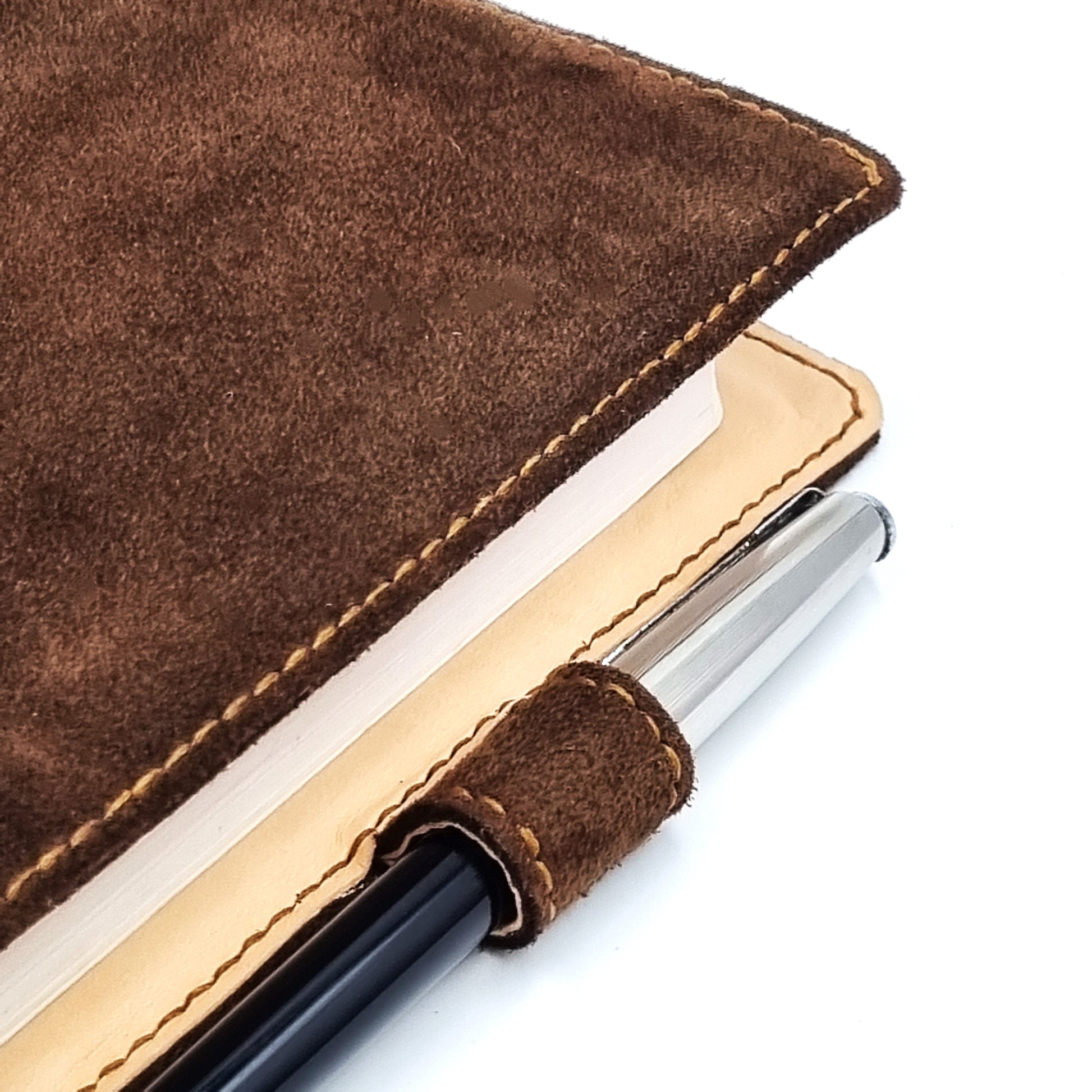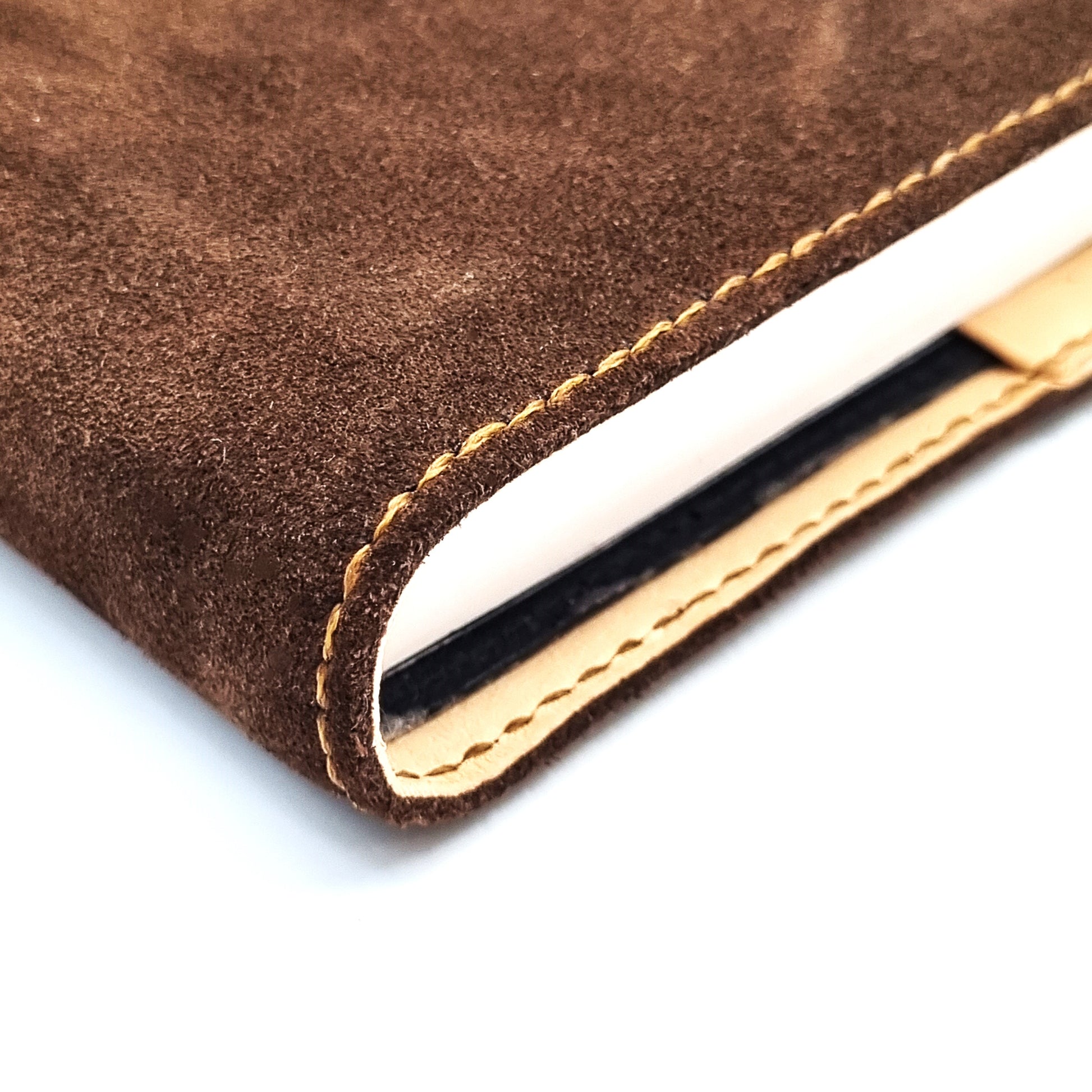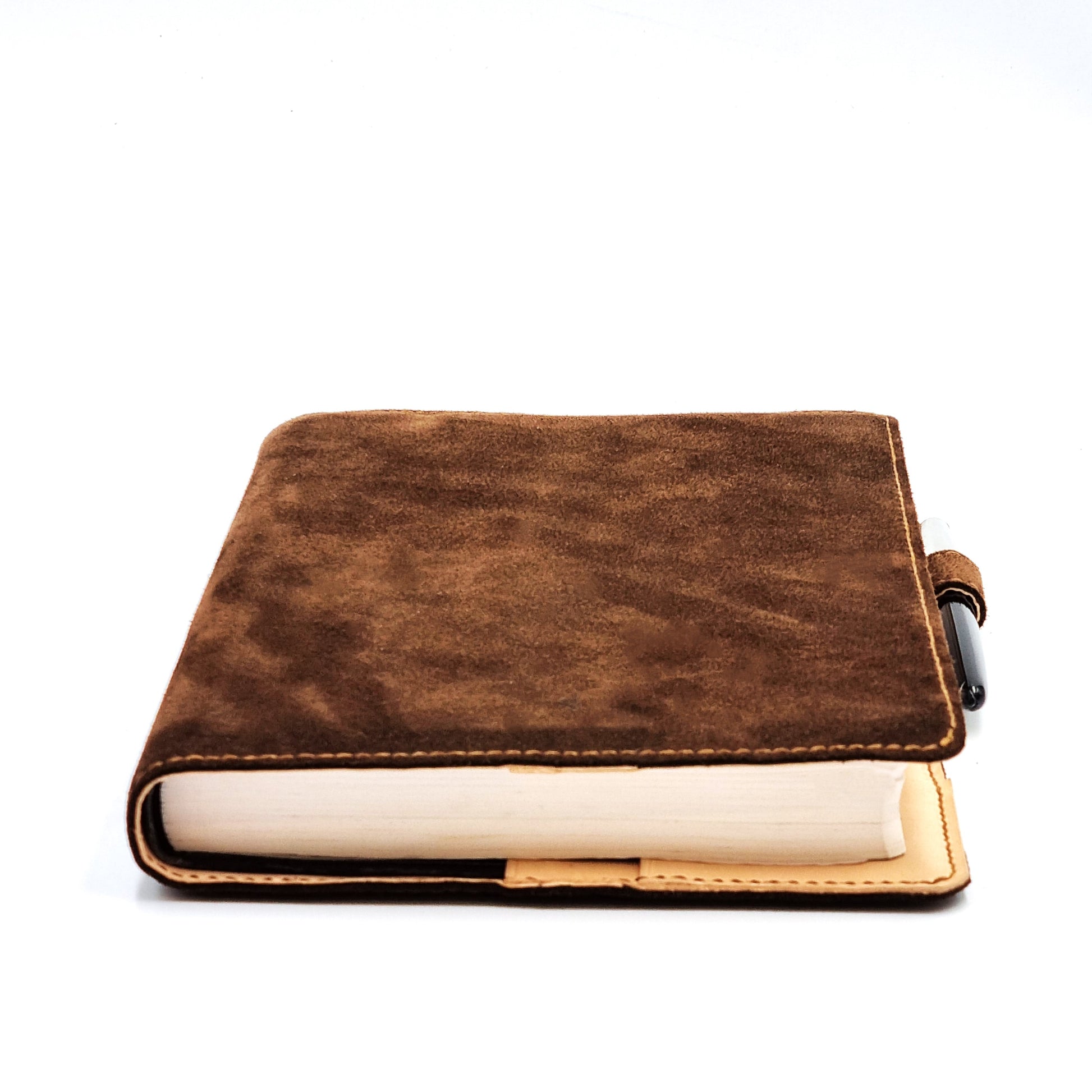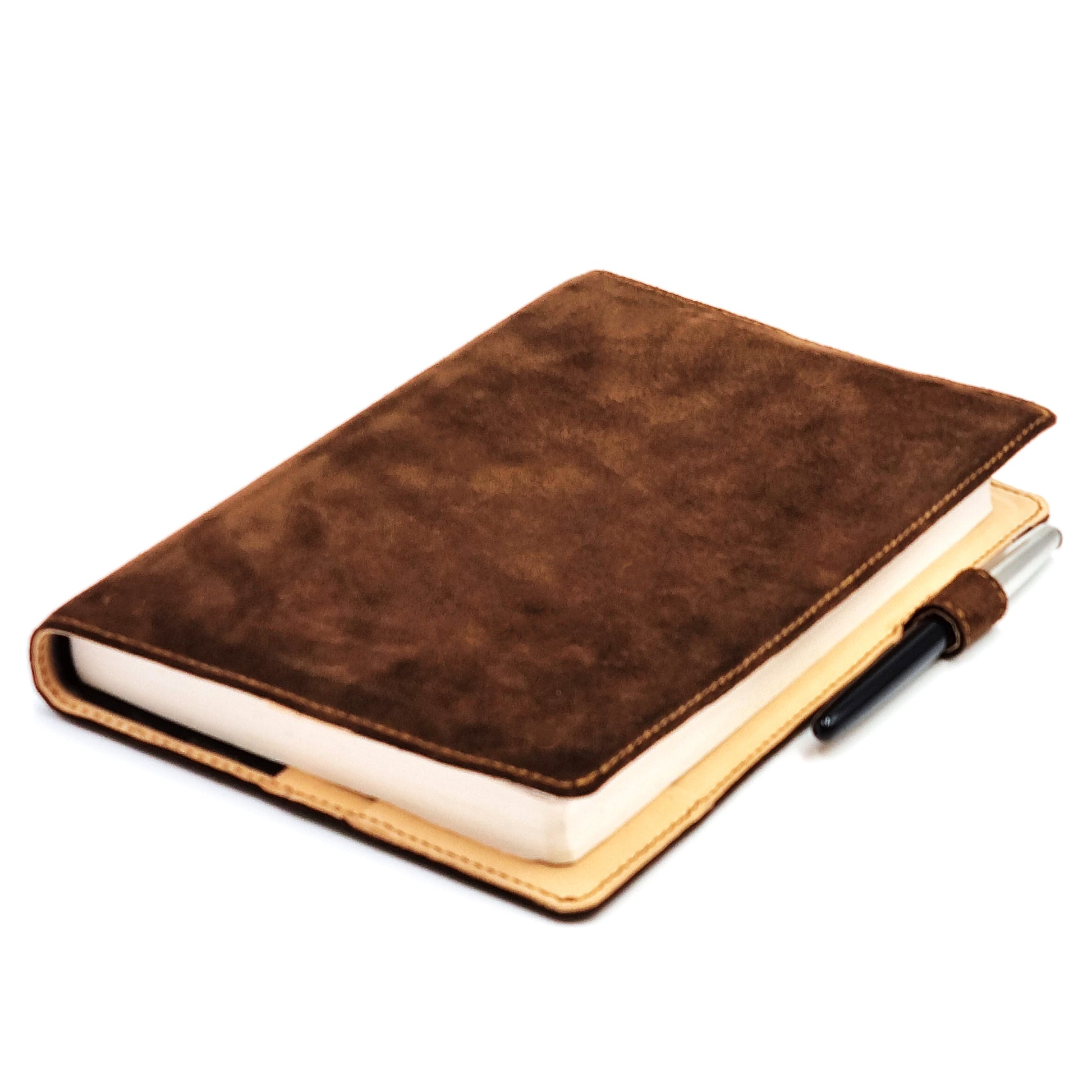3-oz, natural full-grained Italian SUEDE vegetable-tanned, cowhide leather bible cover in A5 portrait format. The lining is of genuine Italian cowhide leather, providing additional protection and cushioning for the bible.  The cover full leather design ensures decades of use without slackening or splitting.  The cover is fully and meticulously hand crafted by experienced craftsmen.