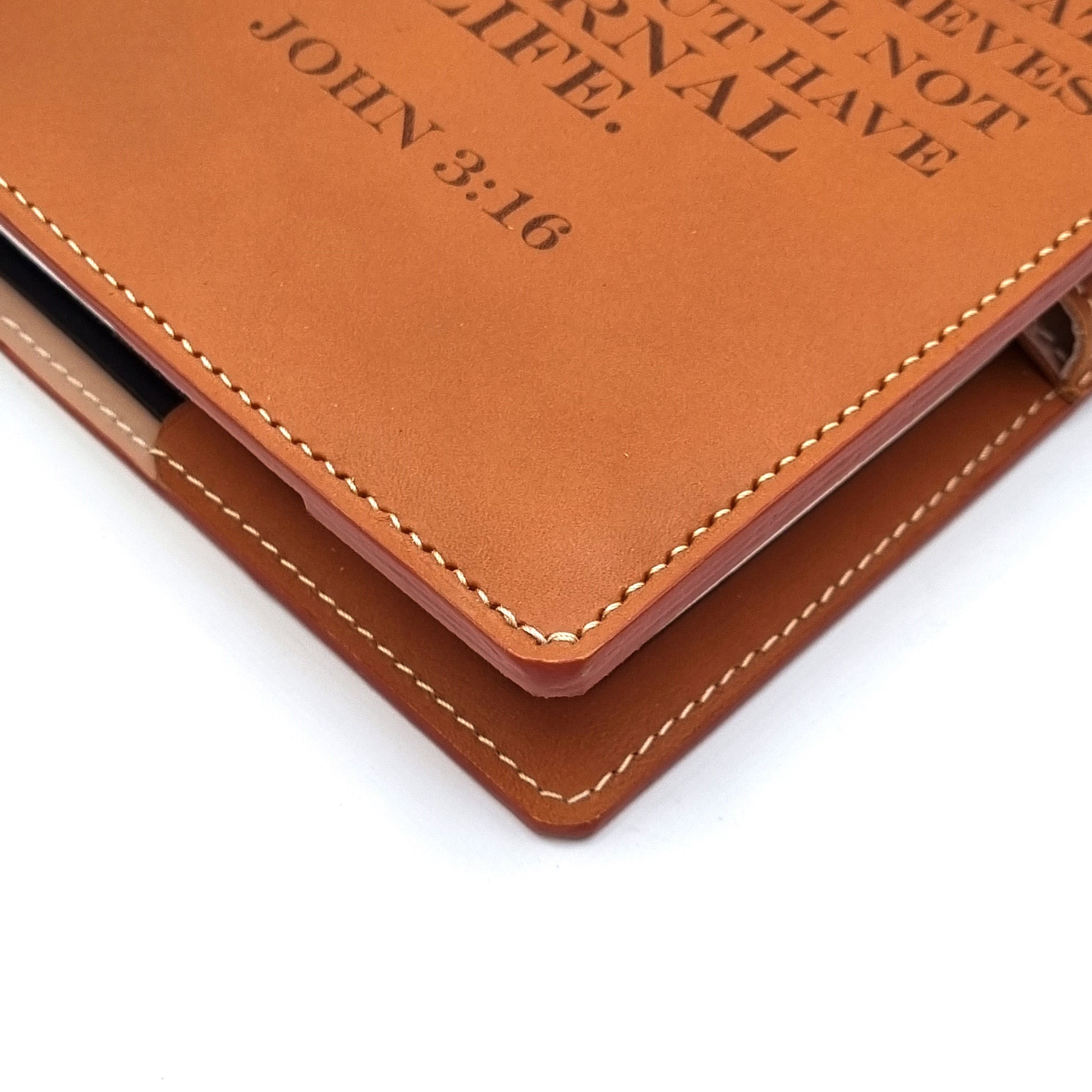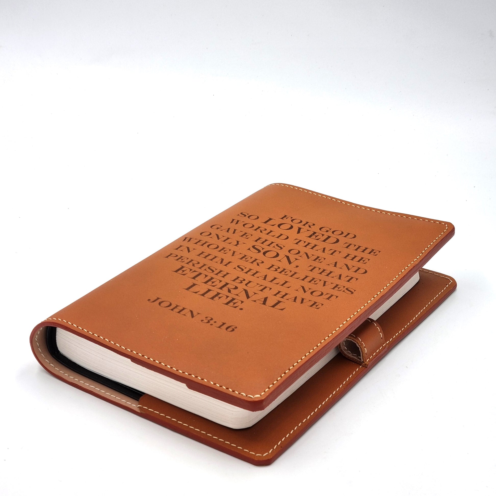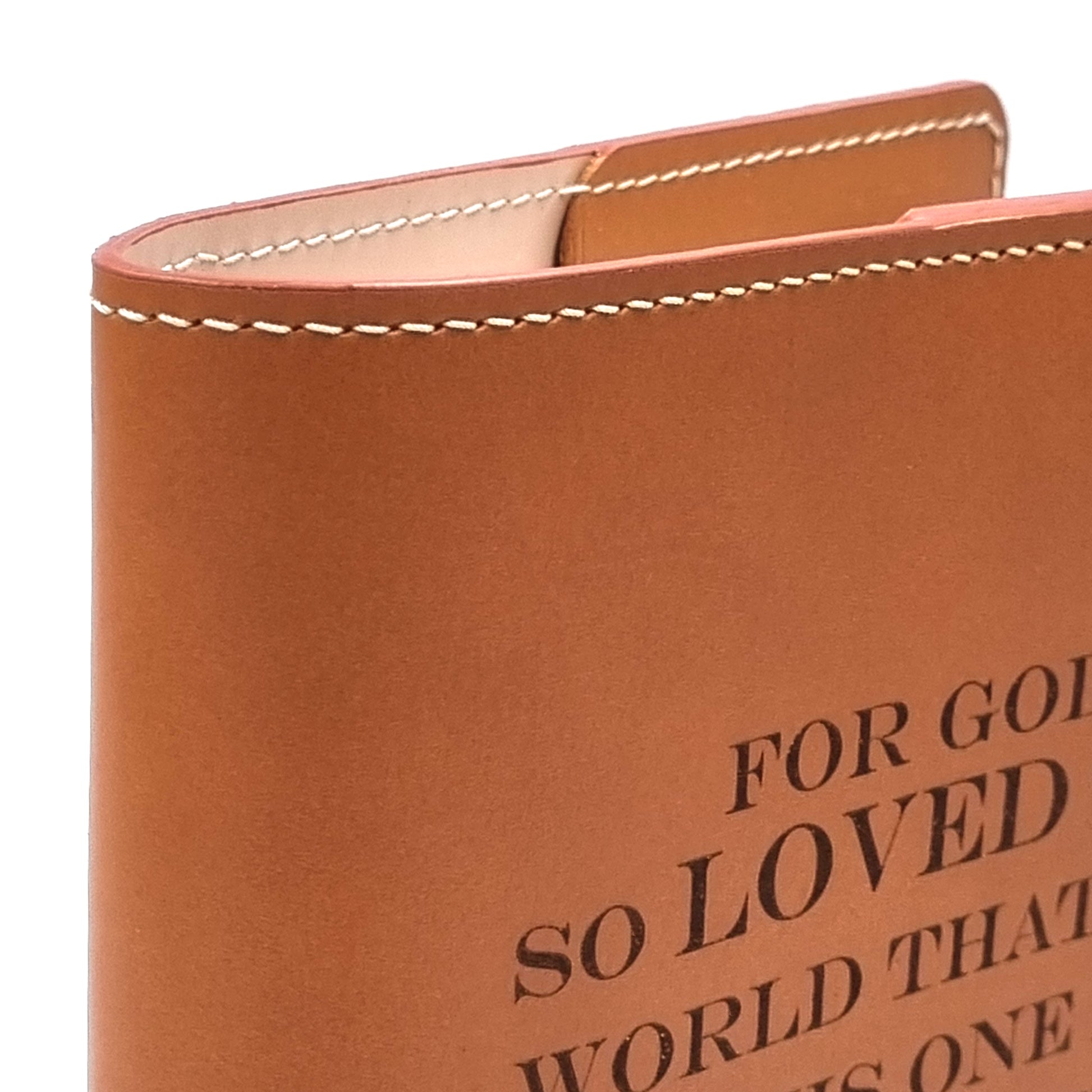 3-oz, natural full-grained Italian cowhide vegetable-tanned, cowhide leather bible cover in A5 portrait format. The lining is of genuine Italian suede leather, providing additional protection and cushioning for the bible.  The cover full leather design ensures decades of use without slackening or splitting.  The cover is fully and meticulously hand crafted by experienced craftsmen.