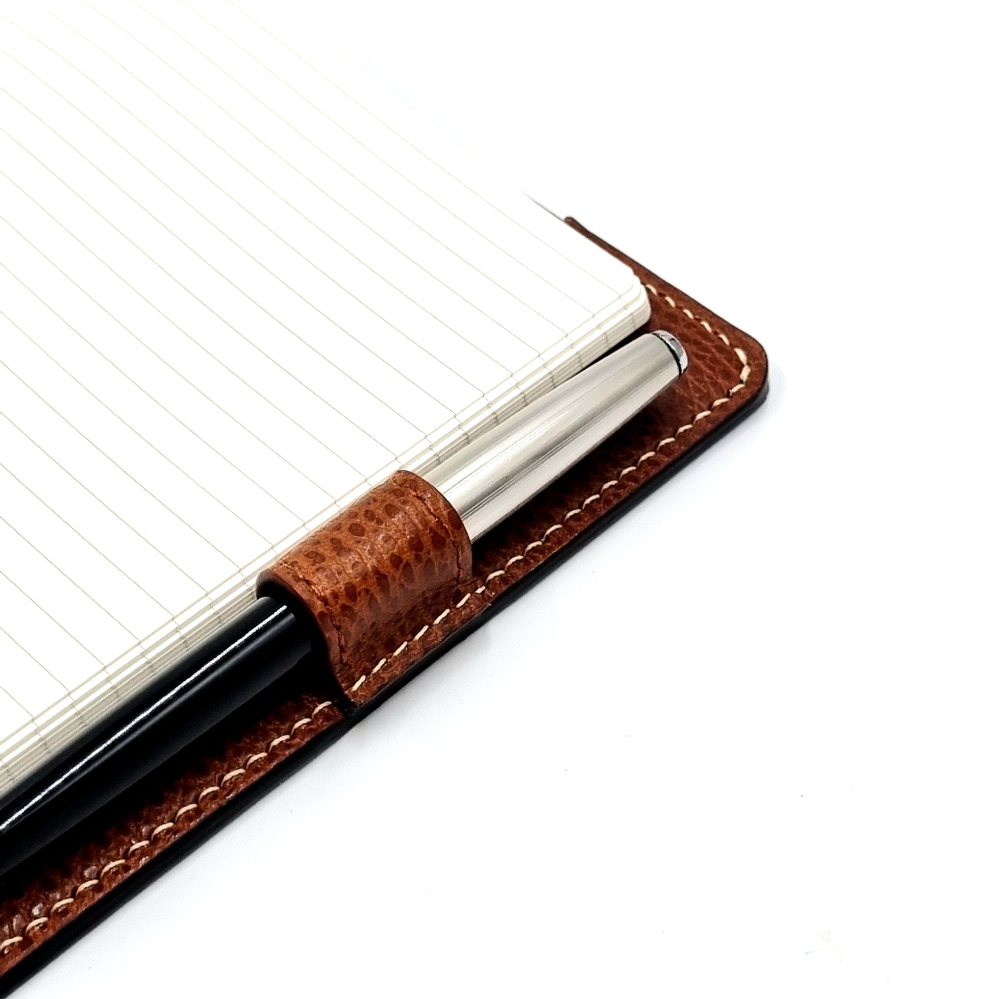 Custom-designed, 3-oz, natural full-grained Italian DOLLARO vegetable-tanned, cowhide leather journal and notebook cover in A5 portrait format. The cover's leather design ensures decades of use without slackening or splitting.  The cover is fully and meticulously hand crafted by experienced craftsmen.  It comes with a looped pen holder which fits most fountain and drawing pens.