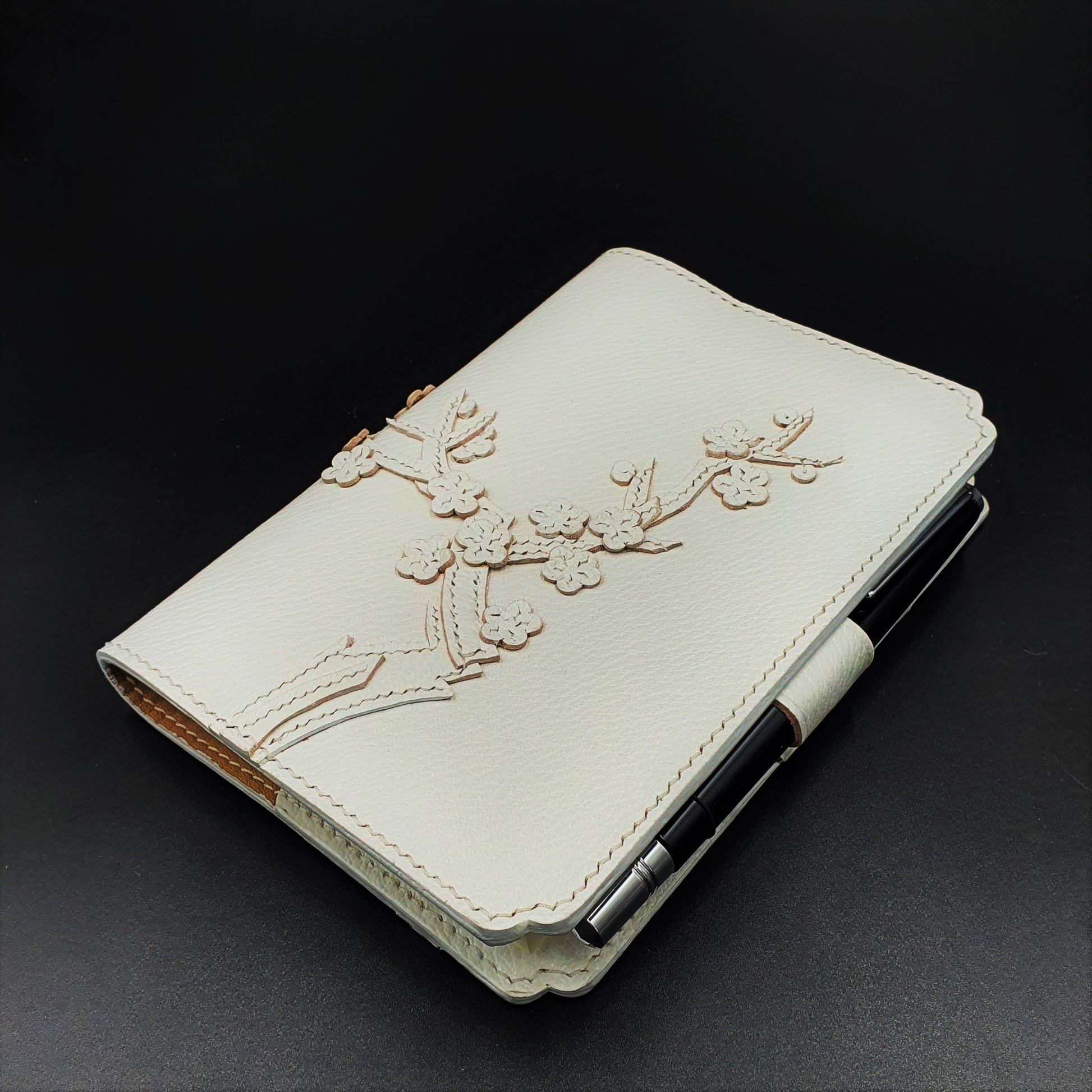4-oz SULLY goat leather from the legendary French tannery ALRAN is used for the construction of the sleeve. Every petal and branch is hand-cut and unique, and hand-stitched onto a leather base. Waxed threads are used to strengthen the seams and bind the leather components. The entire sleeve is saddle-stitched for extended durability - a traditional and time-honoured method in fine leathercrafting.