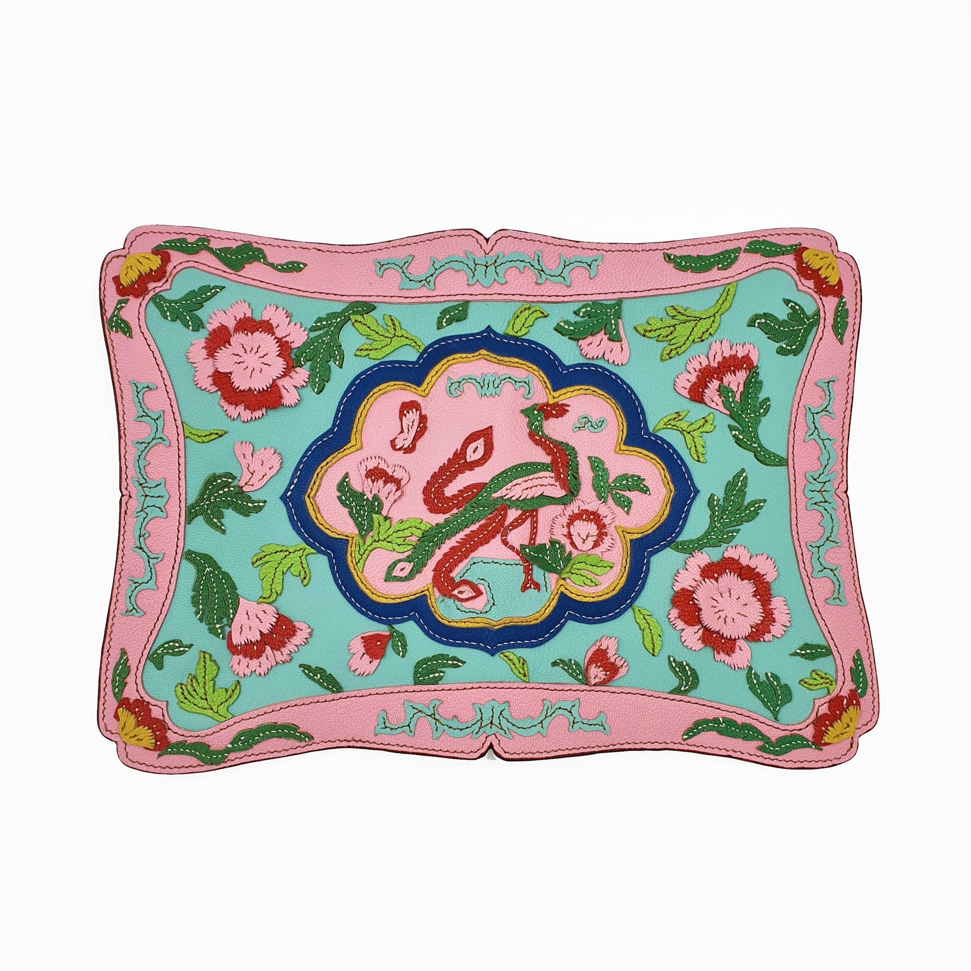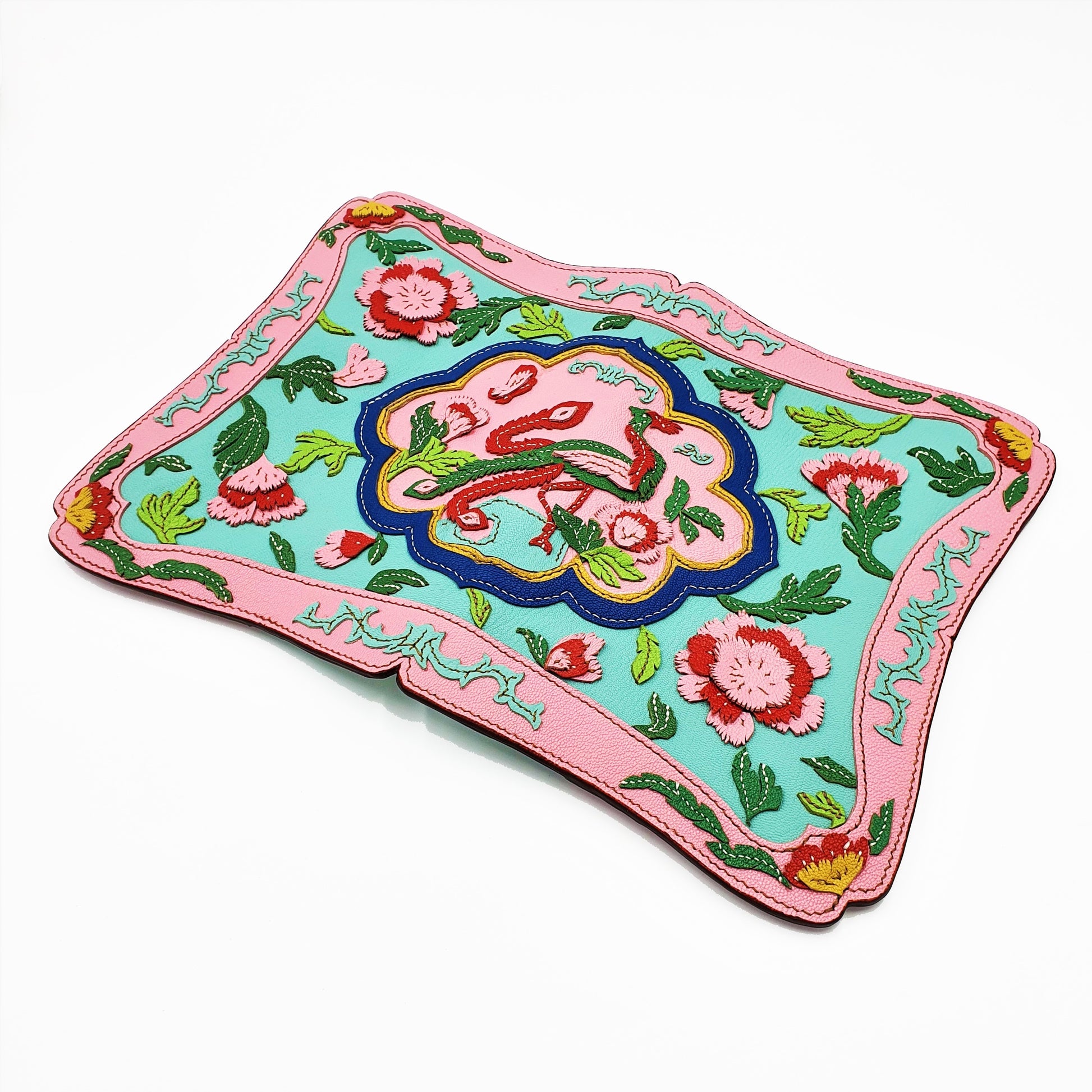 Handcrafted leather notebook sleeve inspired by the unique South-Eastern Asian Peranakan culture which had developed from the interactions between Southern Chinese settlers around the Malay Peninsula and Indonesian Archipelago from the 15th to 17th century AD, the distinctive ornamental motifs - phoenix, peonies, butterfly, bats - and use of colours typically used on the 'Famille Rose' porcelain ( Fencai 粉彩 colours, popular during the 16th century Qing Dynasty ) are influenced by the auspicious symbols and palette that embody prosperity, wealth and happiness while representing the apex of craftsmanship from the Qing era.