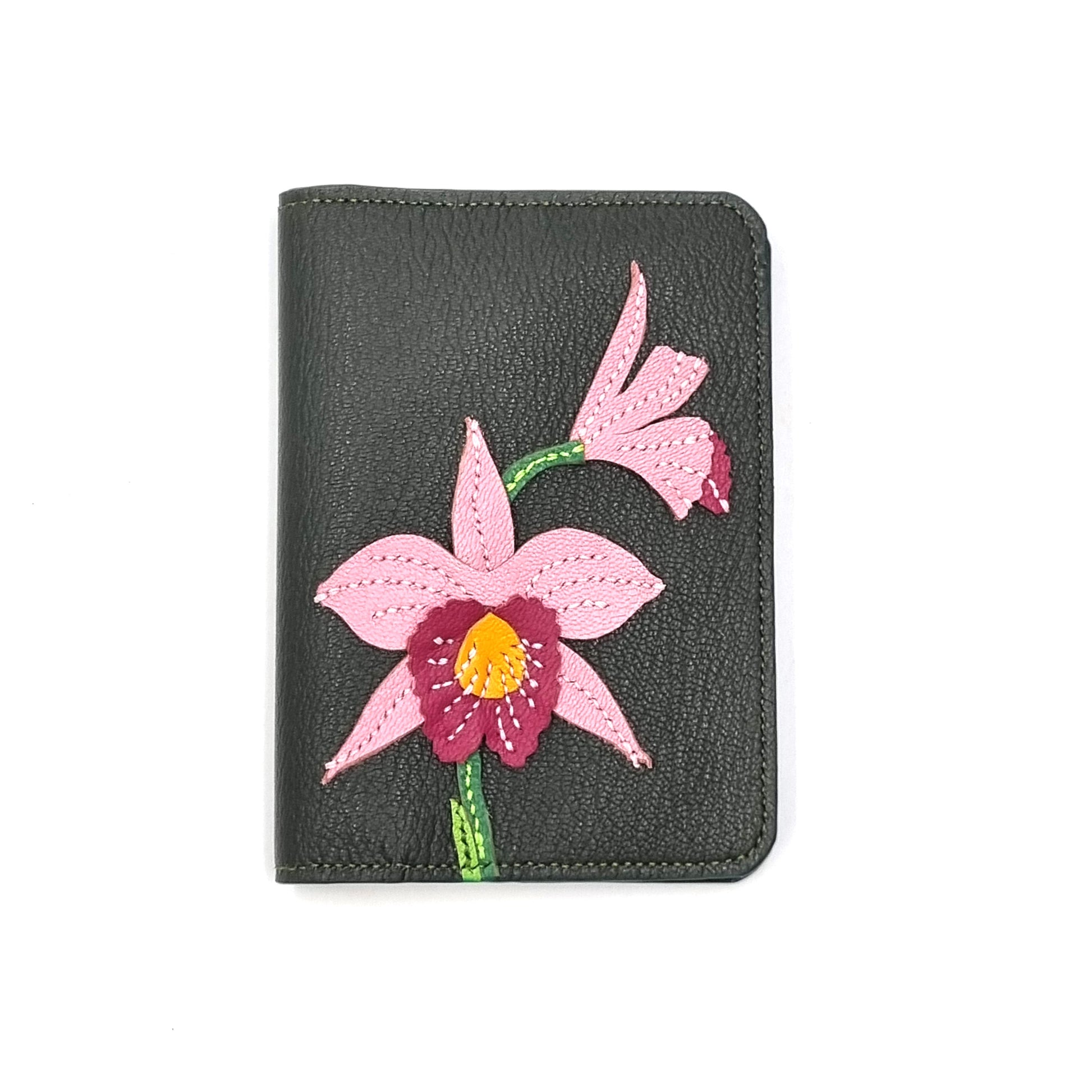 Handcrafted Leather Passport Cover.  Applique motif is representative of the elegant Bamboo orchid, with its graceful, arching inflorescences.