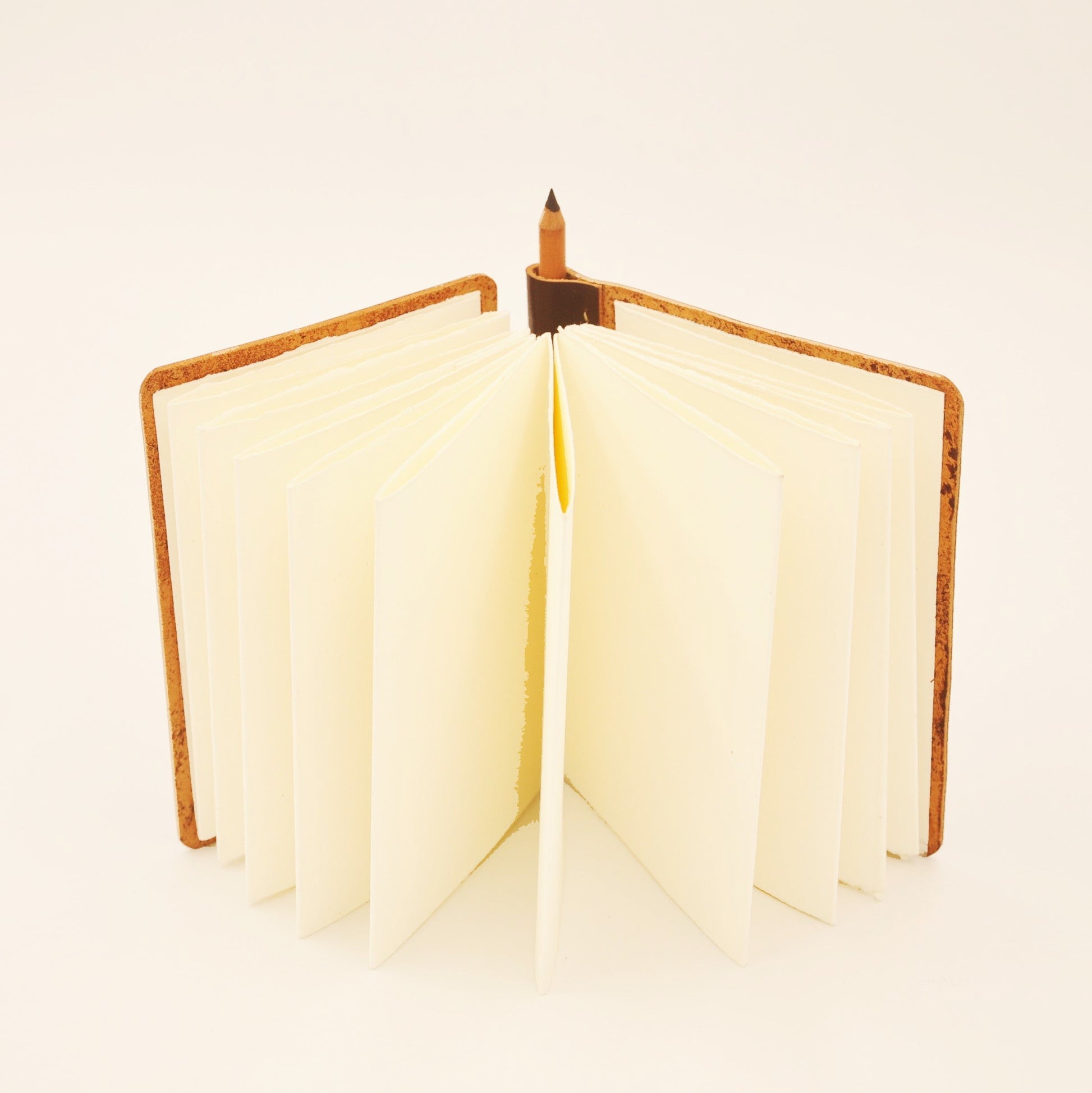Genuine, premium European 4-oz natural, full-grained vegetable-tanned cowhide leather cover accordion sketch album, with 42 pages, continuous archival paper album strip using premium English Saunders St Cuthberts Mill Waterford 190 gsm cold-pressed archival water-colour paper. The paper stock is fully hand-deckled to retain the aesthetics of the artist's paper, and is attached to the leather covers designed with a looped-hinge which is locked with a wooden pencil. The album can be expanded and retracted with the removal and insertion of the pencil. Paper album opens to a full length of 2.28 meters.