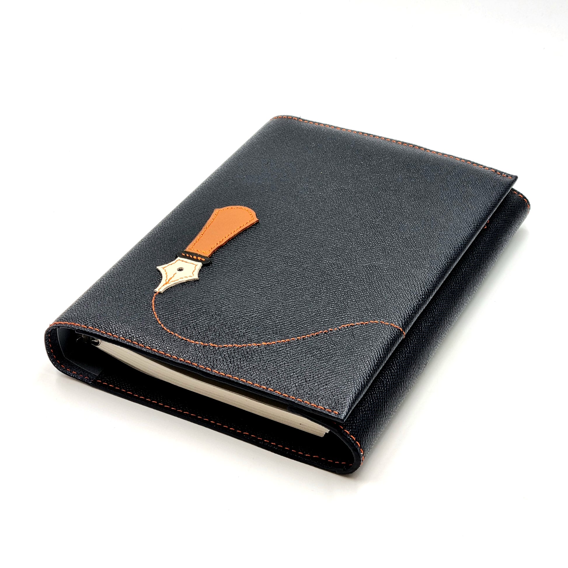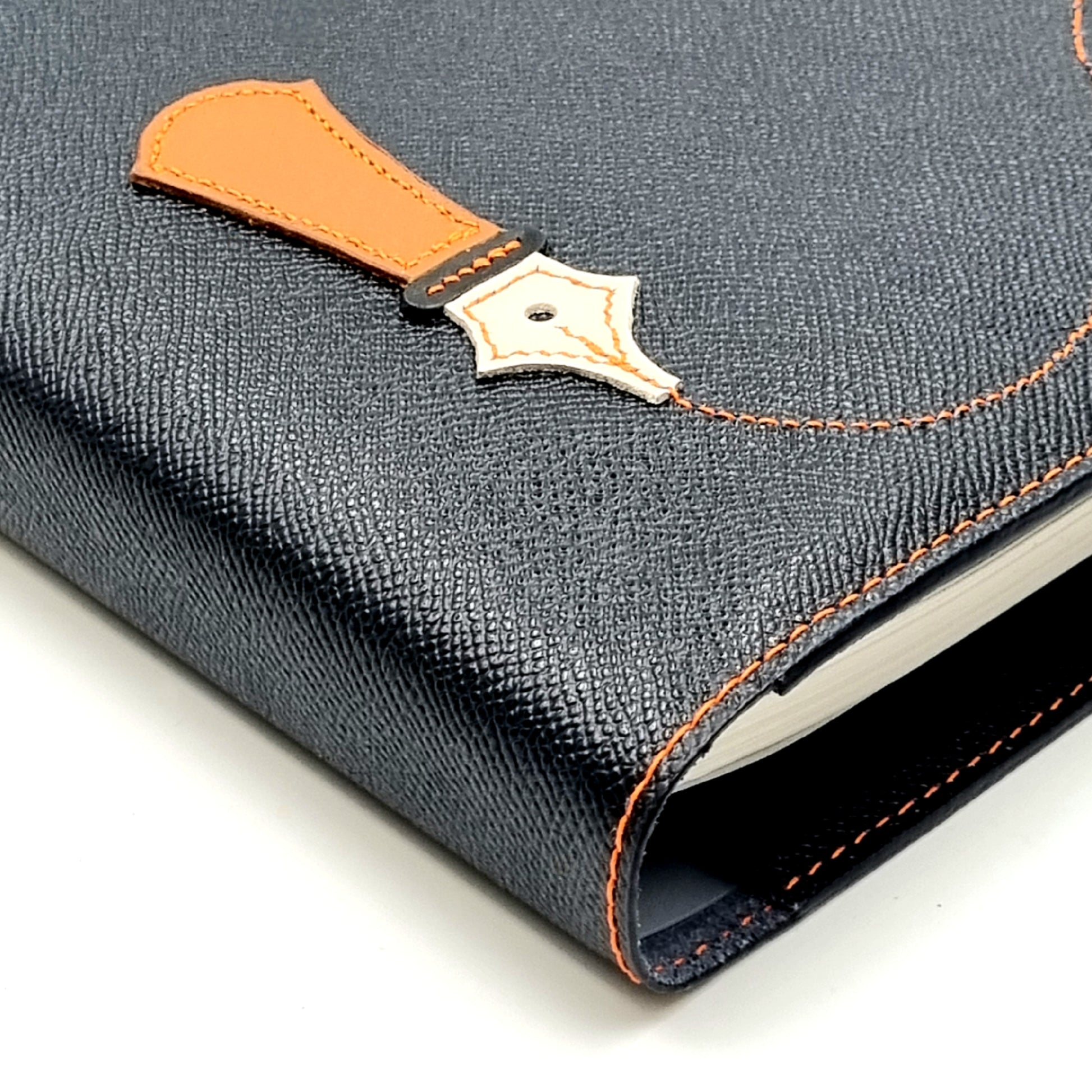 Italian vegetable-tanned, embossed cowhide EPSOM leather Ring-Binder Cover. Fully saddle-stitched by hand - a time-honoured method in leather crafting, which ensure decades of use. Custom designed motifs hand-stitched according to specifications.