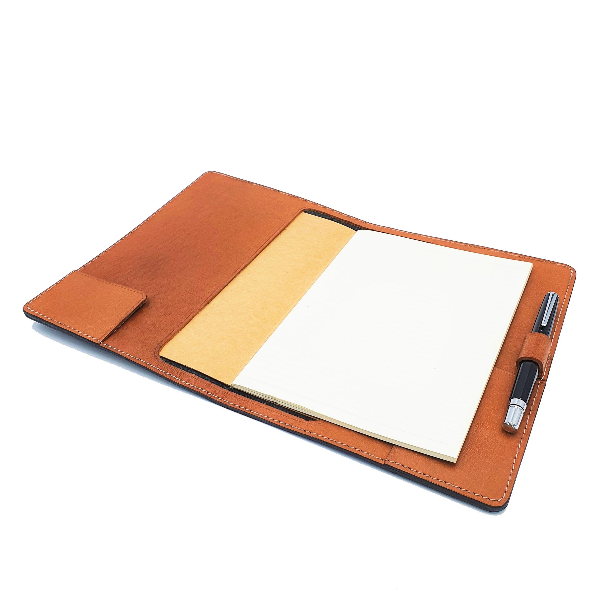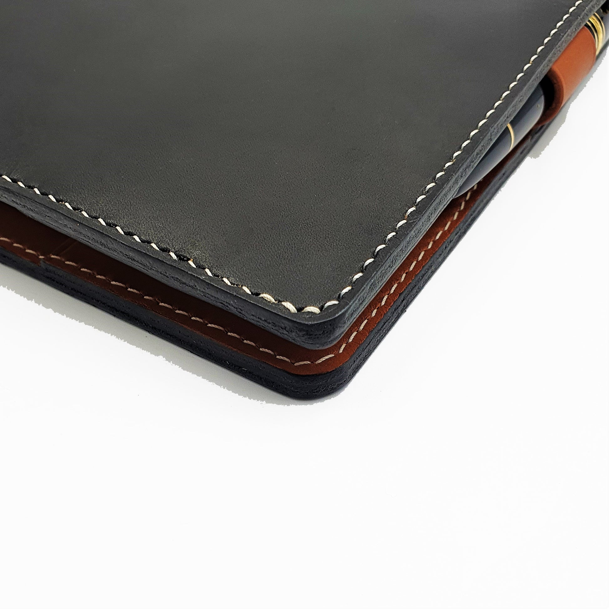 4-oz, natural full-grained vegetable-tanned, European cowhide leather journal and notebook sleeve in A5 portrait format. Zero-waste design in classic duo-tone colour.  The sleeve is fully saddle-stitched by hand - a time-honoured method in leather crafting, which ensure decades of use.  It comes with double looped pen holders which fits most drawing pens and mechanical pencils.