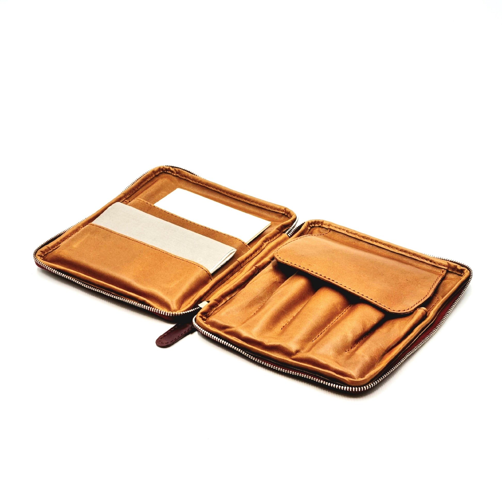 Custom-designed, 3-oz, natural full-grained Italian BUTTERO vegetable-tanned, cowhide leather A6 sized zipper pen case. The case's full leather construction ensures decades of use without slacking or splitting. The cover is fully and meticulously hand crafted by experienced craftsmen. It comes with a 2 notebook and card compartments and a 5-pen holder (which fits most fountain and drawing pens and mechanical pencils).